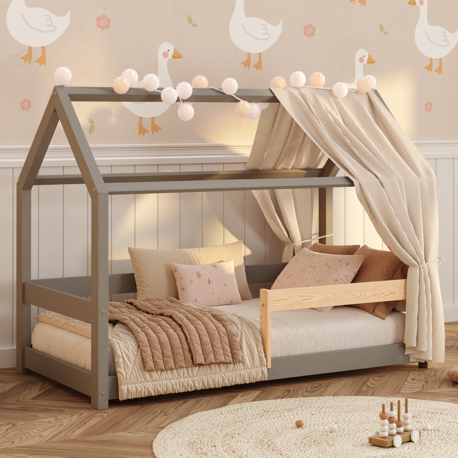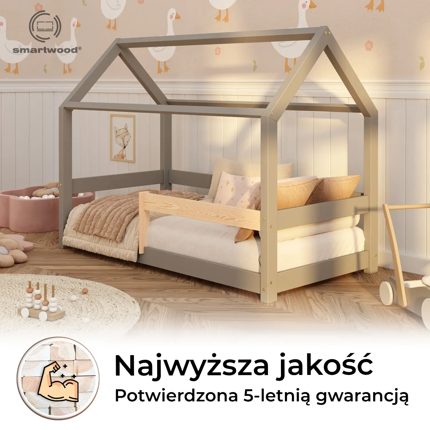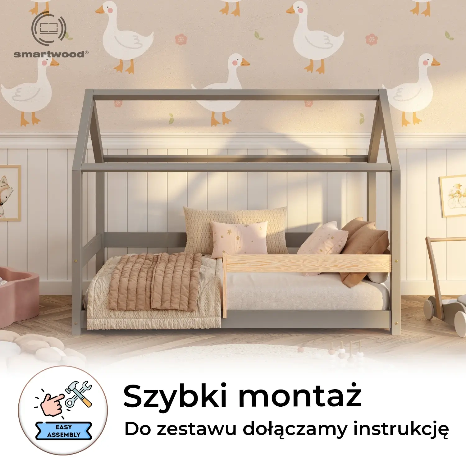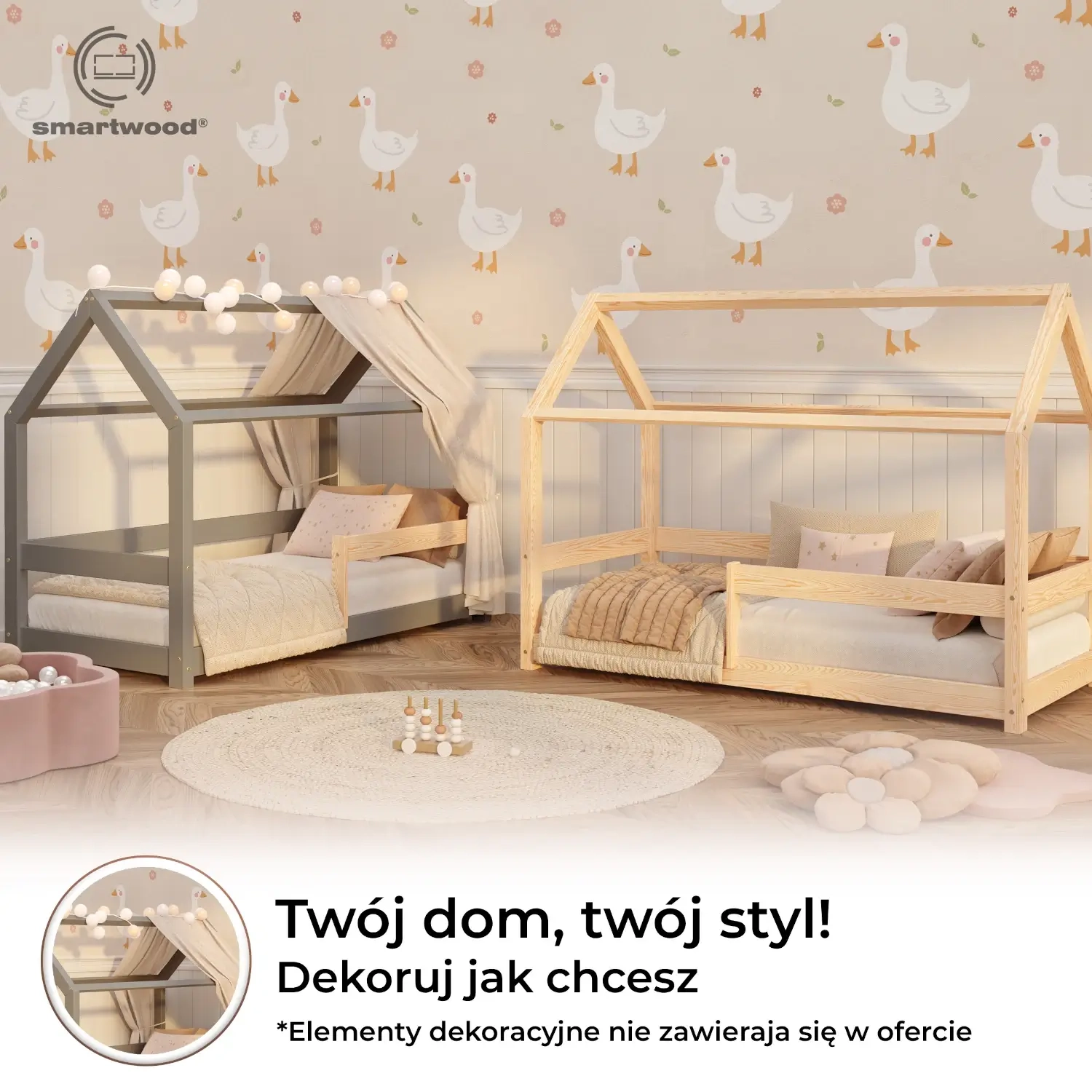 ✔ Przestrzeń pełna wyobraźni – konstrukcja domku pozwala na dekorację baldachimem czy światełkami (elementy dekoracyjne nie są zawarte w ofercie produktu), co nada pokojowi ciepłego i przyjaznego charakteru, rozbudzając kreatywność malucha.