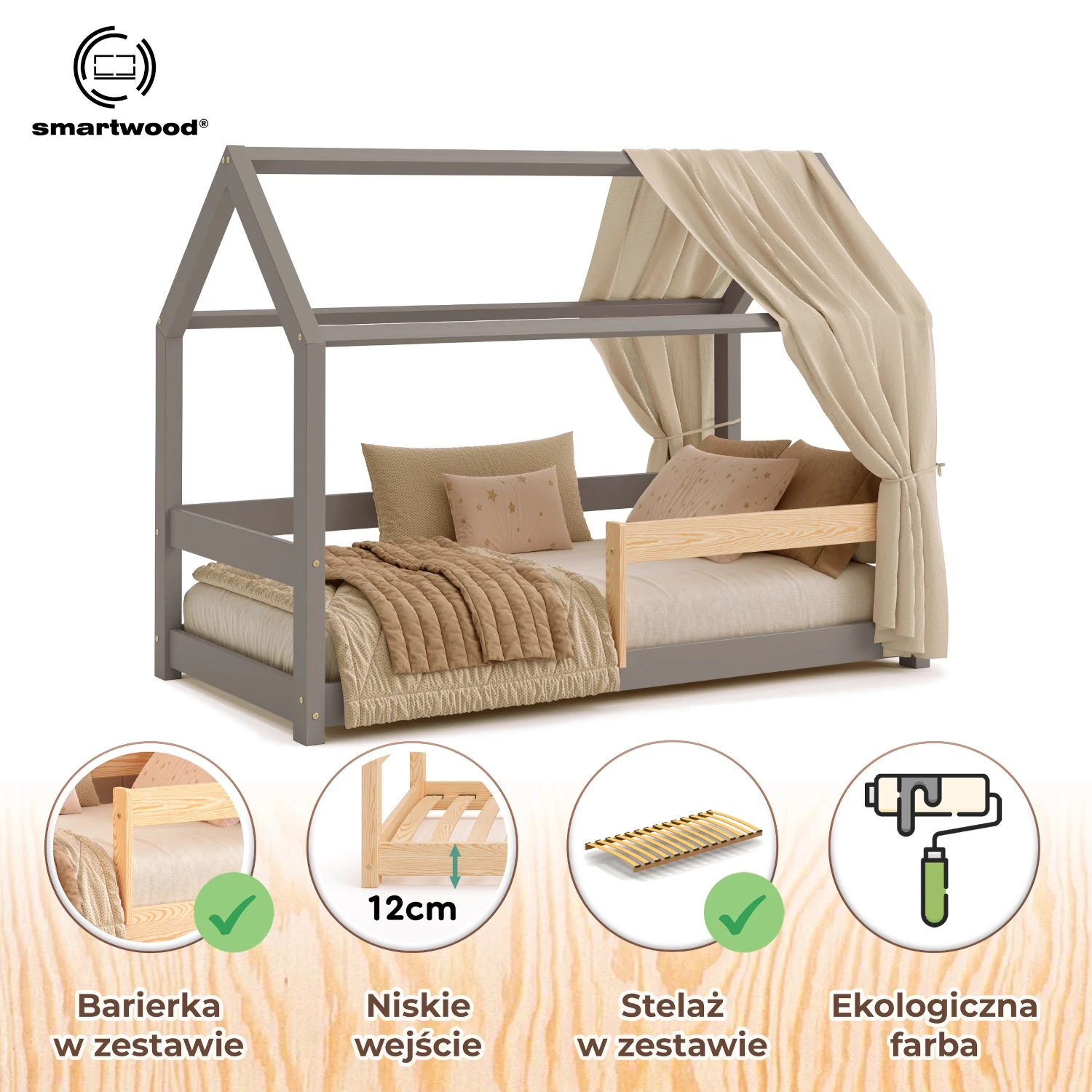 Łóżko domek dla dziecka z barierką i stelażem MILO Montessori Drewniane