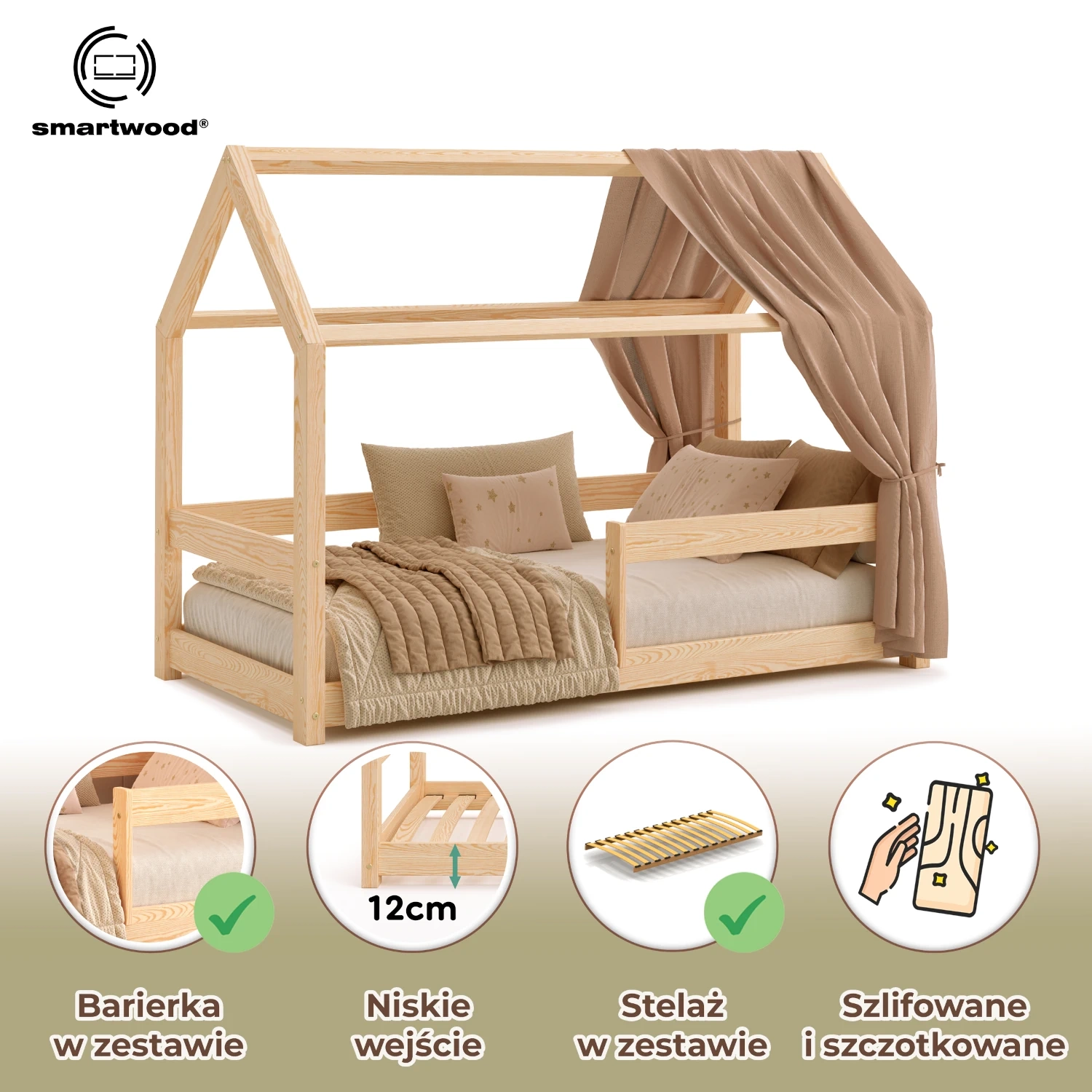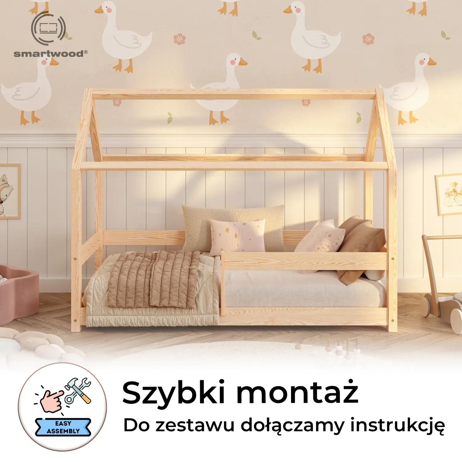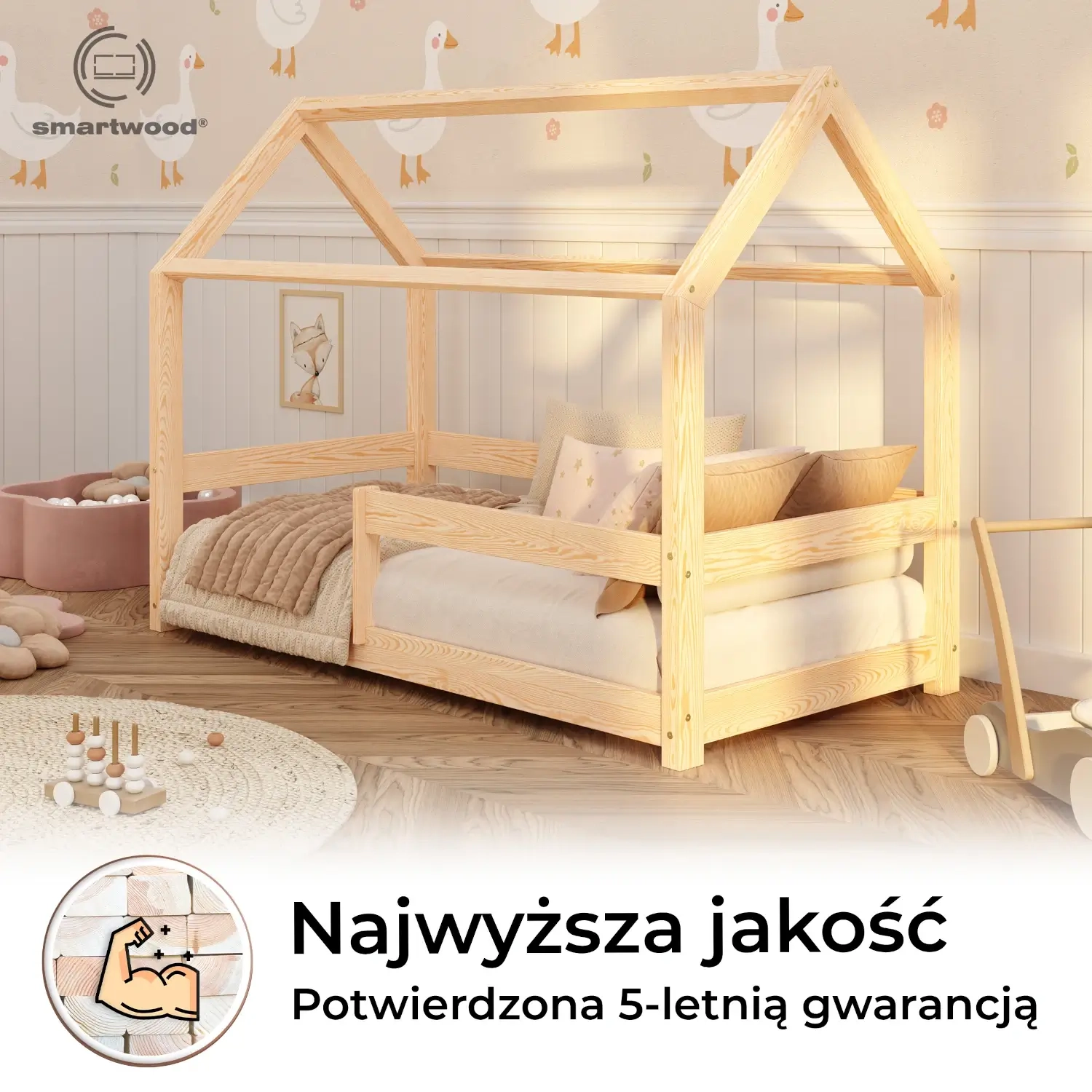 Łóżko domek dla dziecka z barierką i stelażem MILO Montessori Drewniane