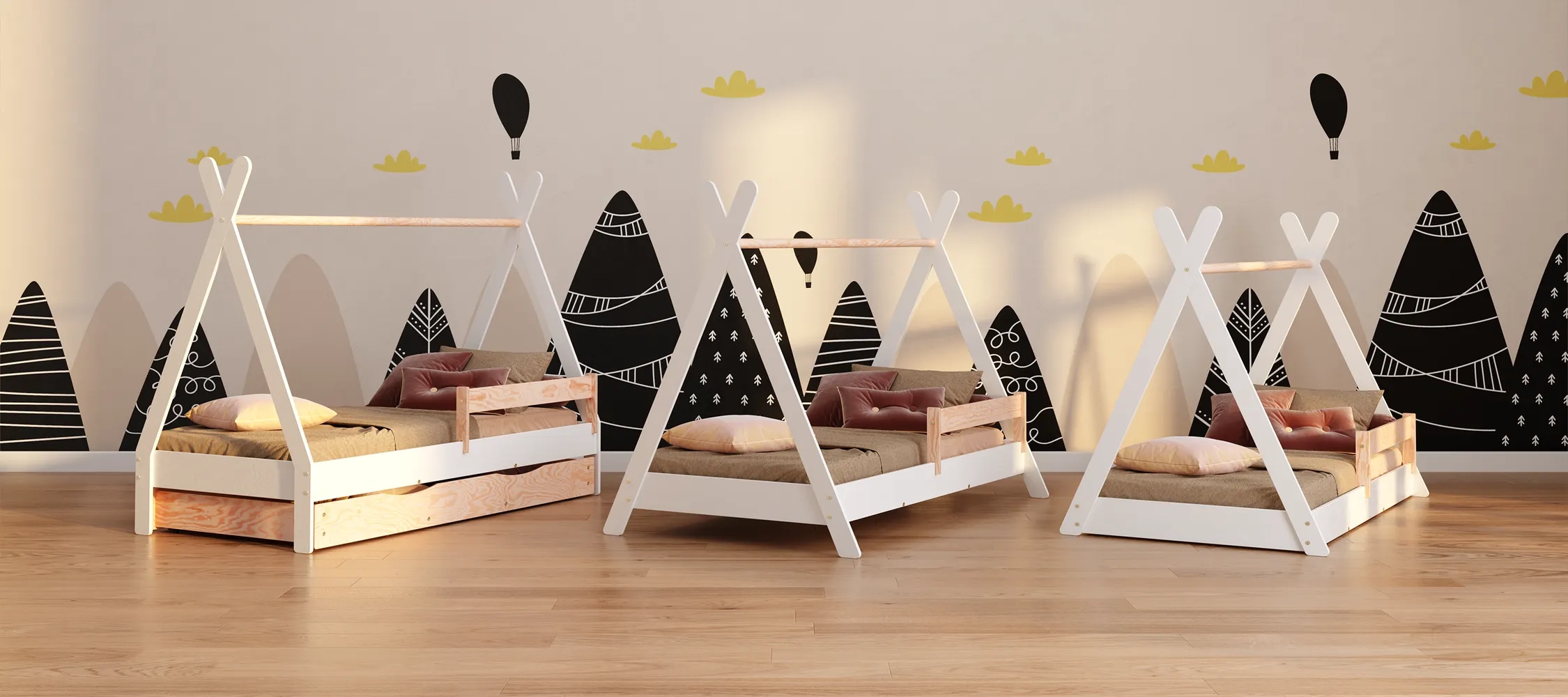 TIPI to więcej niż łóżko – to przestrzeń pełna wyobraźni, która wprowadzi do pokoju Twojego dziecka radość i funkcjonalność. Stwórz wyjątkowe miejsce do snu i zabawy!
