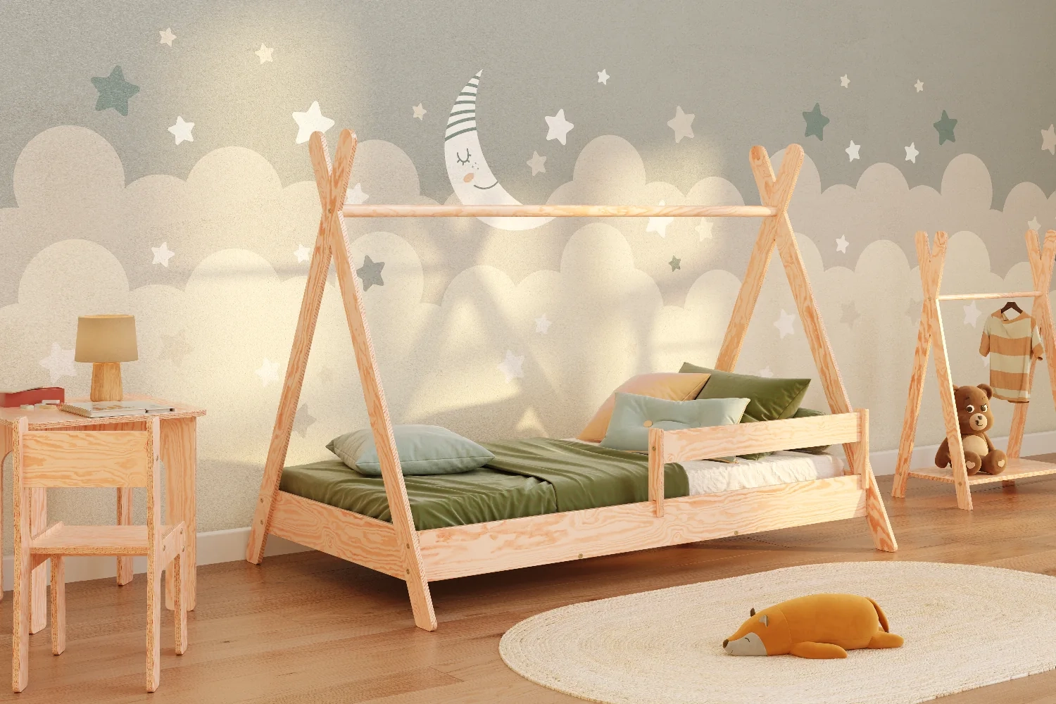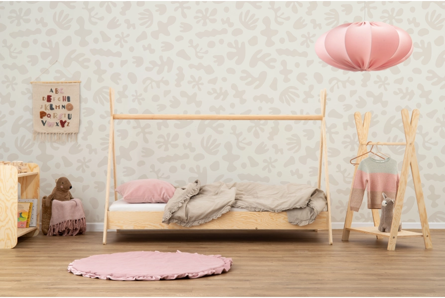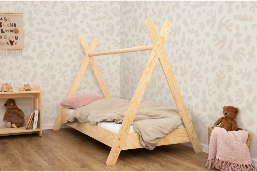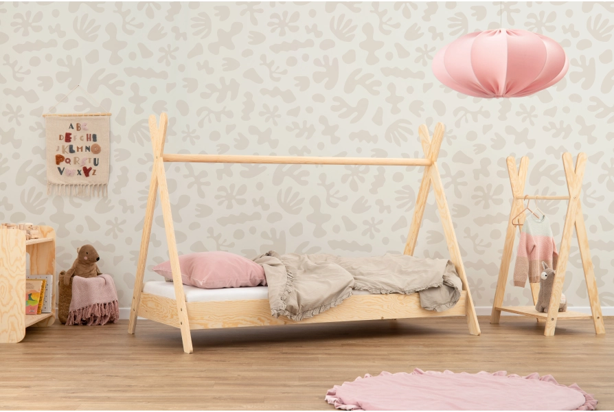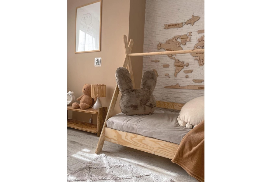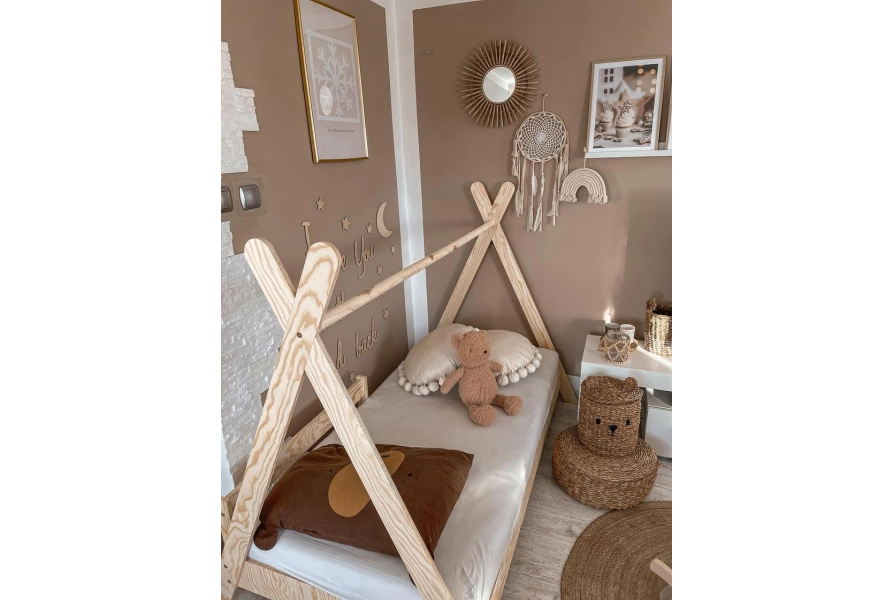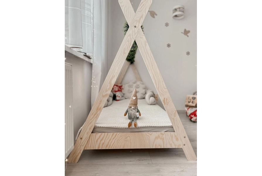 Niepowtarzalny design – kształt tipi z drążkiem łączącym nogi daje możliwość personalizacji łóżka. Dodaj baldachim, światełka czy inne dekoracje, by stworzyć przytulny i magiczny kącik dla Twojego dziecka (elementy dekoracyjne nie są częścią oferty).