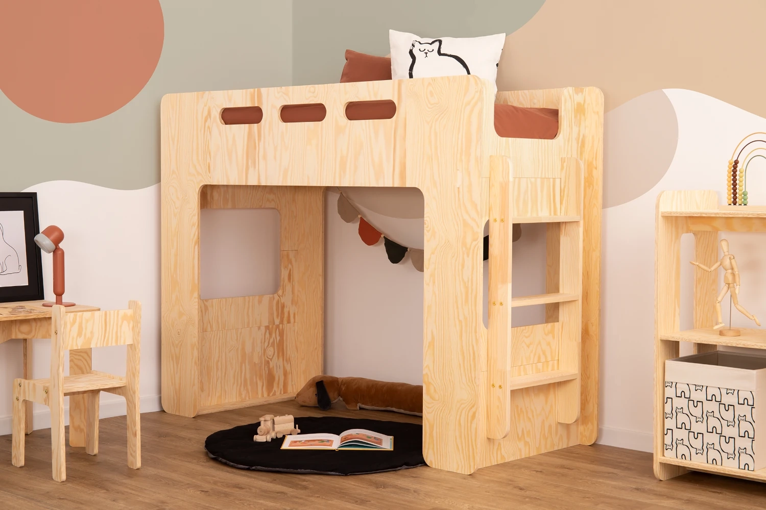 Praktyczne łóżko na antresoli dla dziecka w stylu skandynawskim, oferujące dodatkową przestrzeń pod łóżkiem, którą można wykorzystać na biurko, miejsce do zabawy, strefę relaksu lub przechowywania. Dostępne w 11 kolorach i 13 rozmiarach, wykonane z wysokiej jakości sklejki sosnowej. Idealne łóżko piętrowe dla dziewczynek, jak i chłopców. Solidna konstrukcja z barierką na górnym poziomie i zaokrąglonymi krawędziami gwarantuje maksymalne bezpieczeństwo i wygodę użytkowania. MIMI A to łóżko, które odpowiada na potrzeby aktywnego dziecka i jednocześnie spełnia oczekiwania rodziców w zakresie wygody i bezpieczeństwa, a dołączony w zestawie stelaż, o max. obciążeniu do 130 kg, umożliwia natychmiastowe korzystanie z łóżka po montażu.