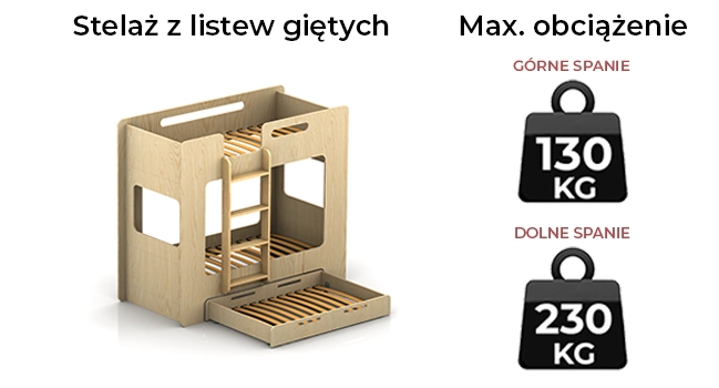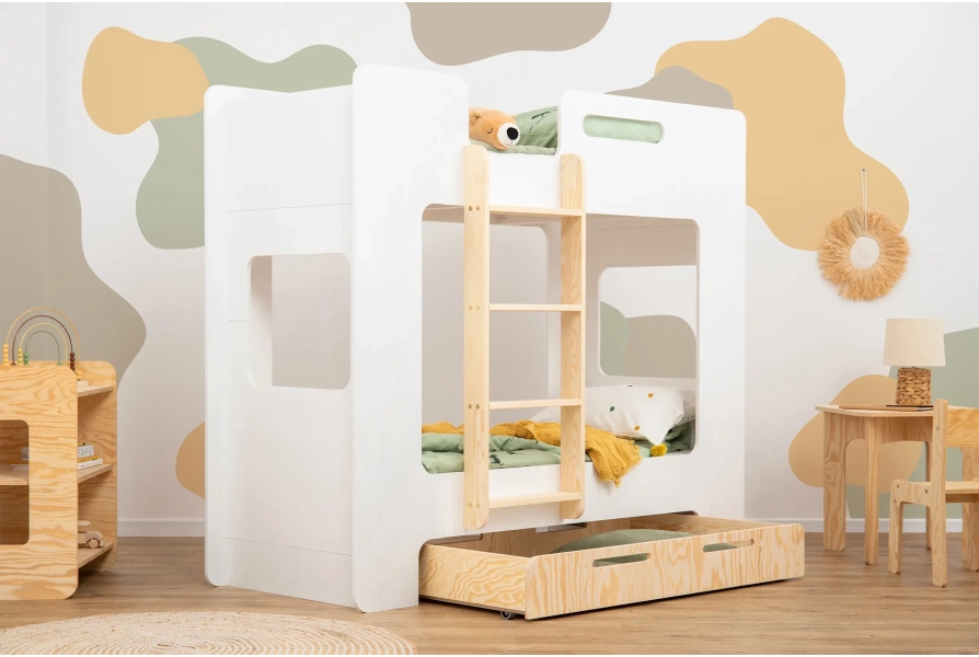 Funkcjonalne łóżko piętrowe dla dzieci w stylu skandynawskim, o unikatowym designie. Wyposażone w szufladę na gumowych kółkach pełniącą funkcję dodatkowego miejsca do spania lub przestrzeni do przechowywania. Wykonane z wysokiej jakości sklejki sosnowej, dostępne w aż 11 kolorach i 13 rozmiarach. Jego solidna konstrukcja z barierkami na górnym poziomie oraz zaokrąglonymi rogami i krawędziami zapewnia maksymalne bezpieczeństwo i komfort użytkowania, potwierdzone certyfikatem jakości prestiżowego niemieckiego Instytutu Prüfengel. Dołączone w zestawie stelaże, o max. obciążeniu do 230 kg, umożliwiają natychmiastowe korzystanie z łóżka po montażu.