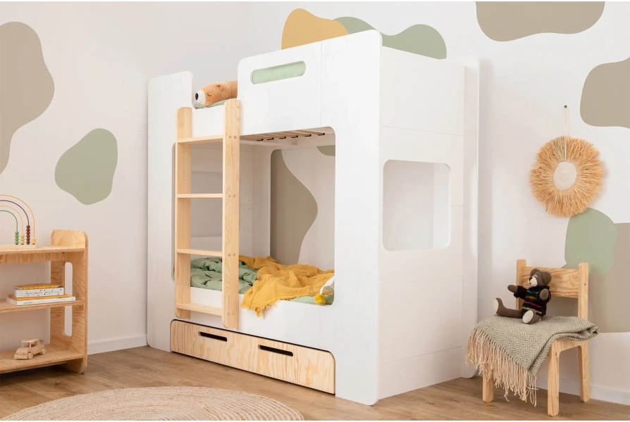 DOKŁADNE WYMIARYŁóżko piętrowe dla dzieci z szufladą i stelażem MIMI D Montessori Drewniane