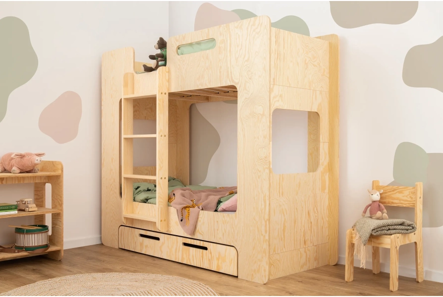 Łóżko piętrowe dla dzieci z szufladą i stelażem MIMI D Montessori Drewniane