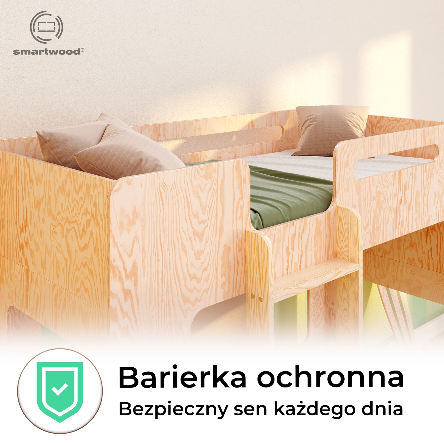 ✔ Podwójna ochrona – barierki na obu poziomach zapewniają poczucie bezpieczeństwa, zarówno na górnym, jak i dolnym łóżku, tworząc komfortową i przytulną przestrzeń do snu.