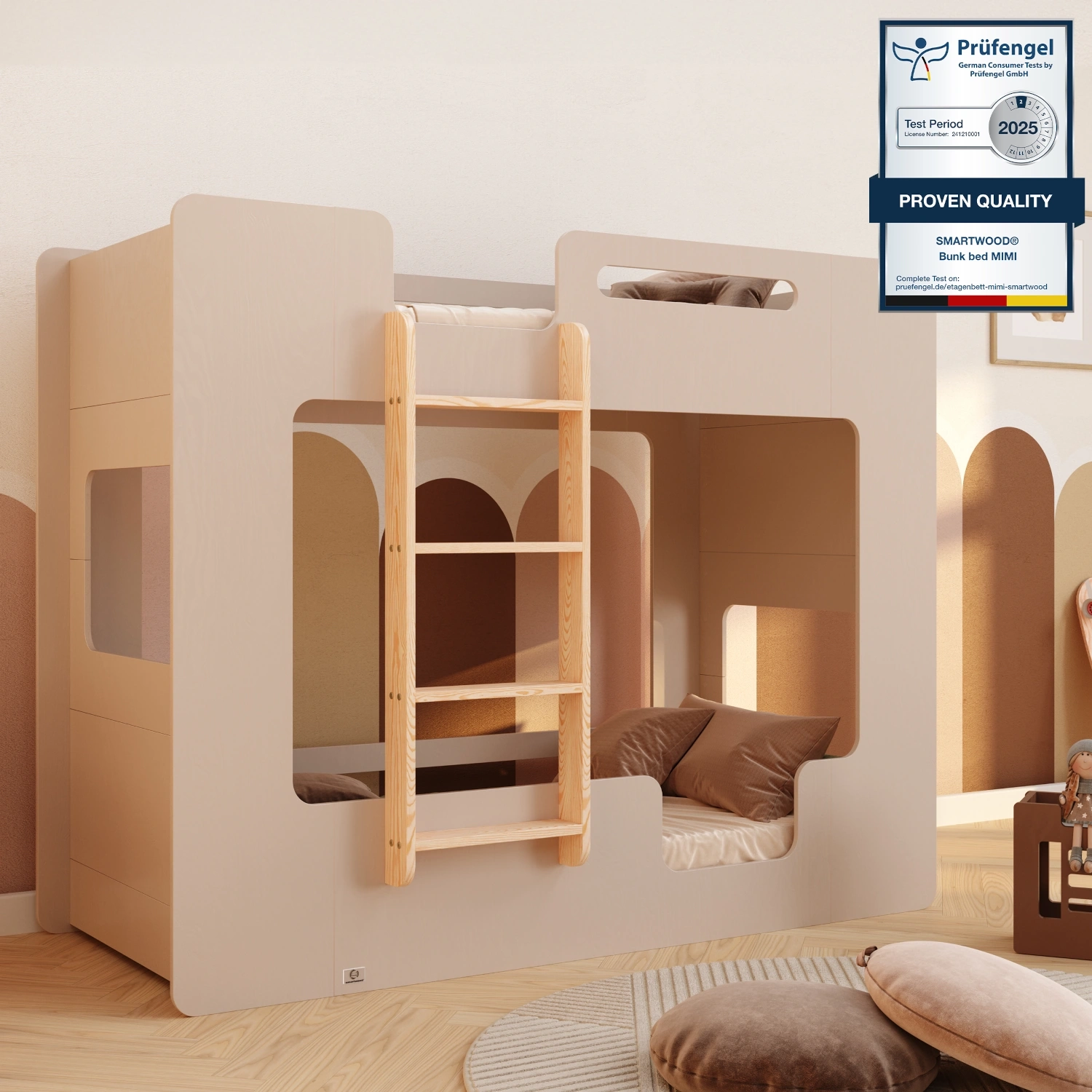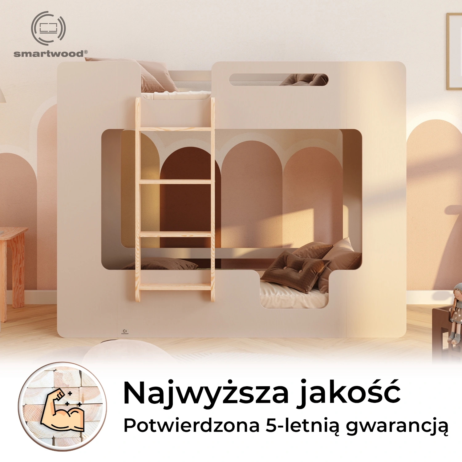 Łóżko piętrowe MIMI B to wyjątkowe rozwiązanie dla dzieci, łączące bezpieczeństwo z niepowtarzalnym designem. Okna po bokach nadają łóżku przytulnego klimatu i tworzą przestrzeń do kreatywnej zabawy, inspirując dzieci do kreowania własnych opowieści. Dostępne w 11 kolorach i 12 rozmiarach, dzięki czemu umożliwia dopasowanie do indywidualnych potrzeb. Wykonane z wysokiej jakości sklejki sosnowej, posiada solidną konstrukcję z barierkami na obu poziomach oraz zaokrąglonymi krawędziami dla pełnego bezpieczeństwa. Model ten został również doceniony przez niemiecki Instytut Prüfengel i otrzymał prestiżowy certyfikat jakości. Dołączone w zestawie stelaże, o max. obciążeniu do 230 kg, umożliwiają natychmiastowe korzystanie z łóżka po montażu.