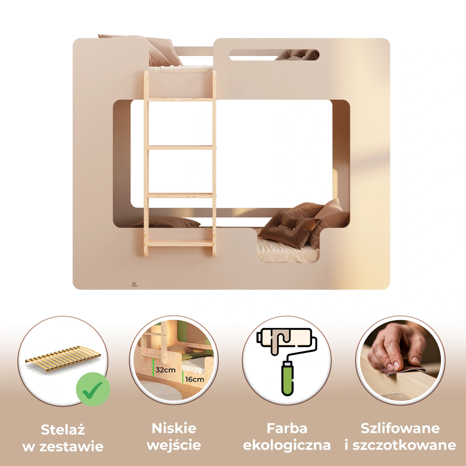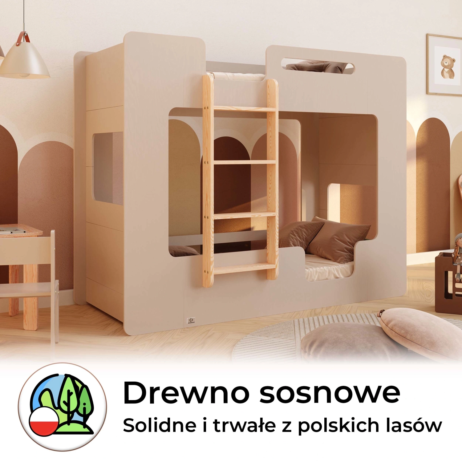DOKŁADNE WYMIARYŁóżko piętrowe dla dzieci z barierkami i stelażem MIMI B Montessori Drewniane