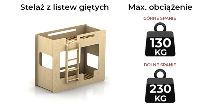 ✔ Wytrzymałość dostosowana do potrzeb – dolne łóżko z nośnością do 230 kg idealnie sprawdzi się dla aktywnych maluchów, podczas gdy górne z obciążeniem do 130 kg oferuje stabilność i ochronę podczas snu.
