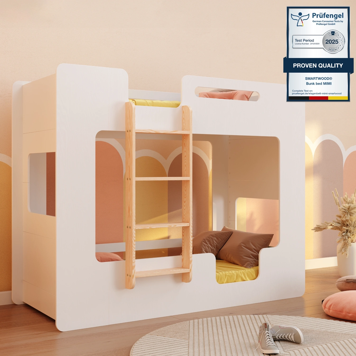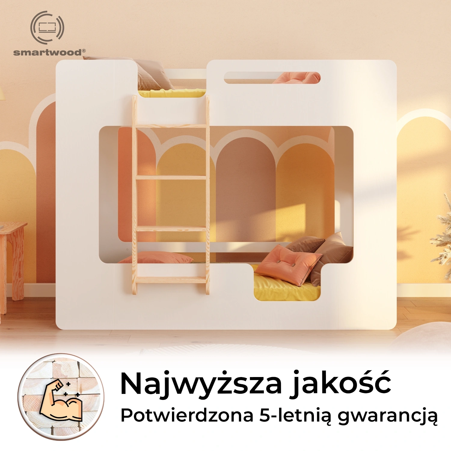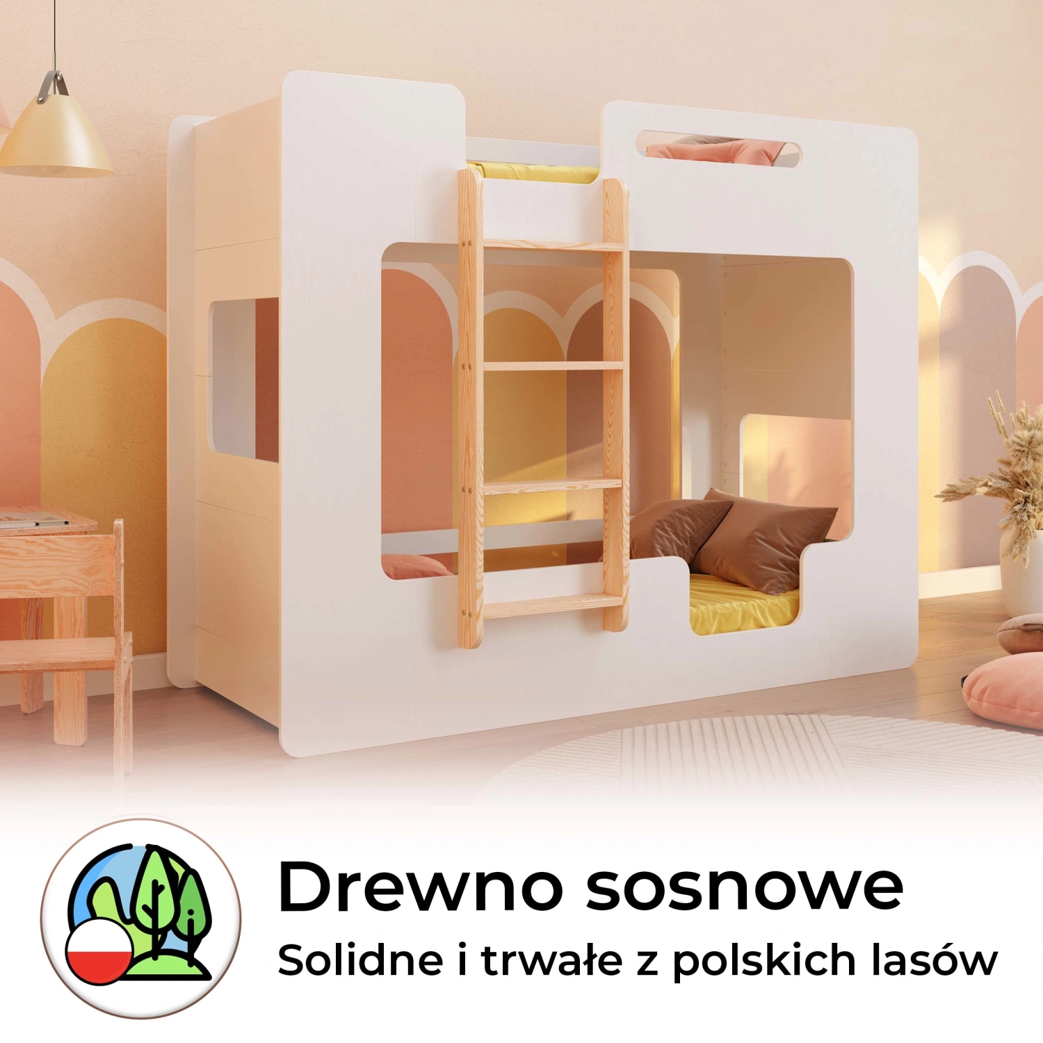 Łóżko piętrowe MIMI B to wyjątkowe rozwiązanie dla dzieci, łączące bezpieczeństwo z niepowtarzalnym designem. Okna po bokach nadają łóżku przytulnego klimatu i tworzą przestrzeń do kreatywnej zabawy, inspirując dzieci do kreowania własnych opowieści. Dostępne w 11 kolorach i 12 rozmiarach, dzięki czemu umożliwia dopasowanie do indywidualnych potrzeb. Wykonane z wysokiej jakości sklejki sosnowej, posiada solidną konstrukcję z barierkami na obu poziomach oraz zaokrąglonymi krawędziami dla pełnego bezpieczeństwa. Model ten został również doceniony przez niemiecki Instytut Prüfengel i otrzymał prestiżowy certyfikat jakości. Dołączone w zestawie stelaże, o max. obciążeniu do 230 kg, umożliwiają natychmiastowe korzystanie z łóżka po montażu.