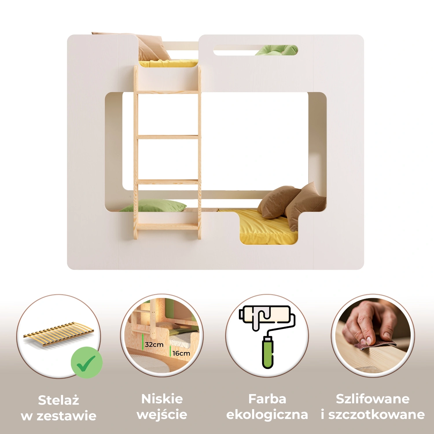 DOKŁADNE WYMIARYŁóżko piętrowe dla dzieci z barierkami i stelażem MIMI B Montessori Drewniane