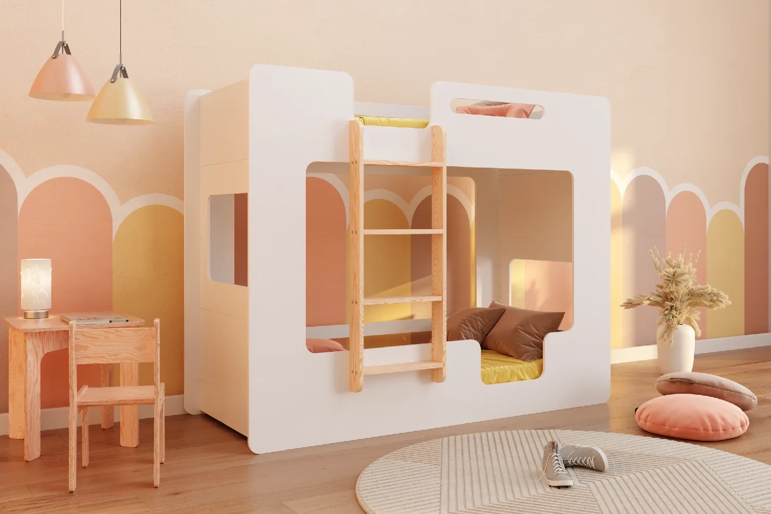 MIMI B to piętrowe łóżko, które łączy funkcjonalność z troską o bezpieczeństwo najmłodszych. Stwórz przyjazne i praktyczne miejsce do snu i zabawy dla swoich dzieci!
