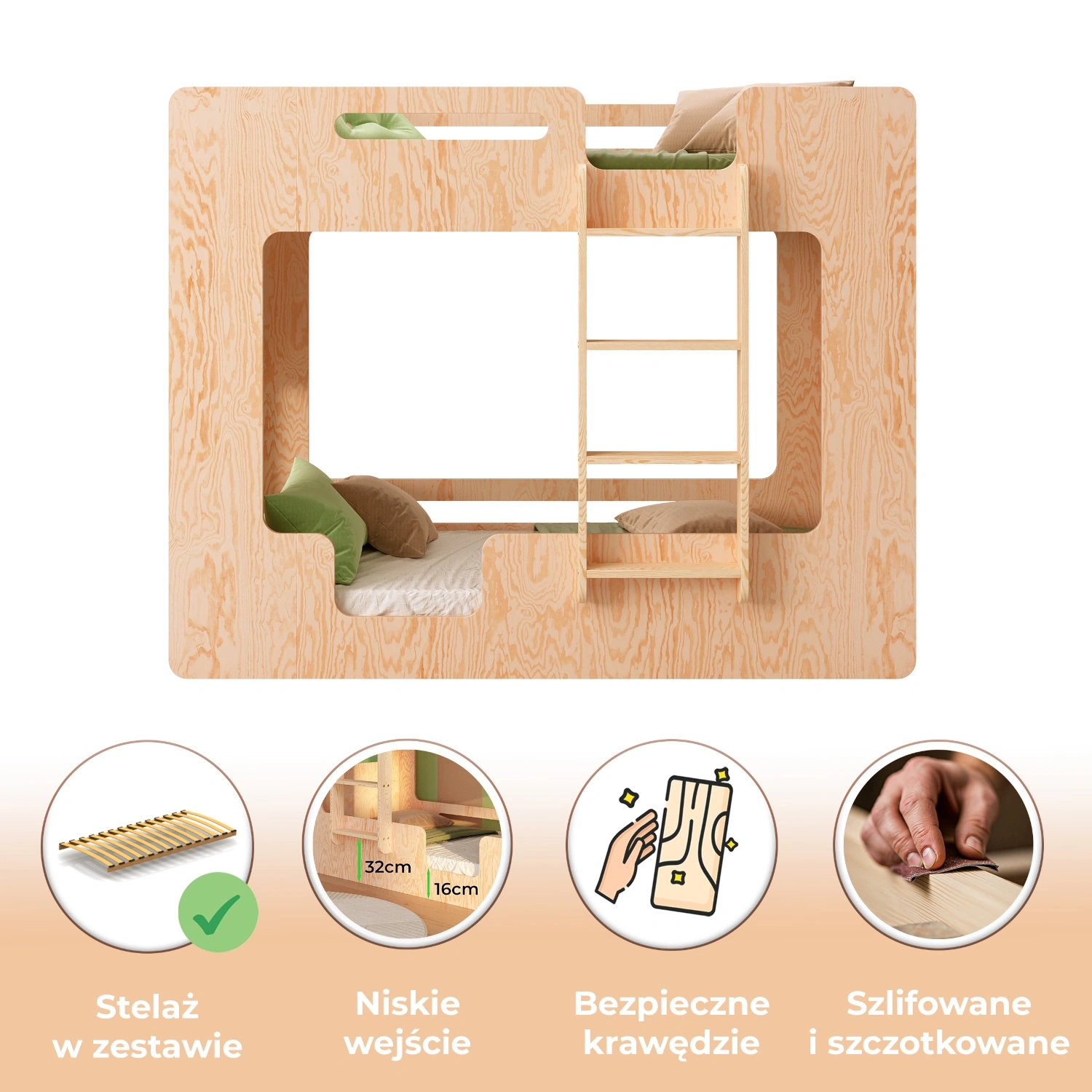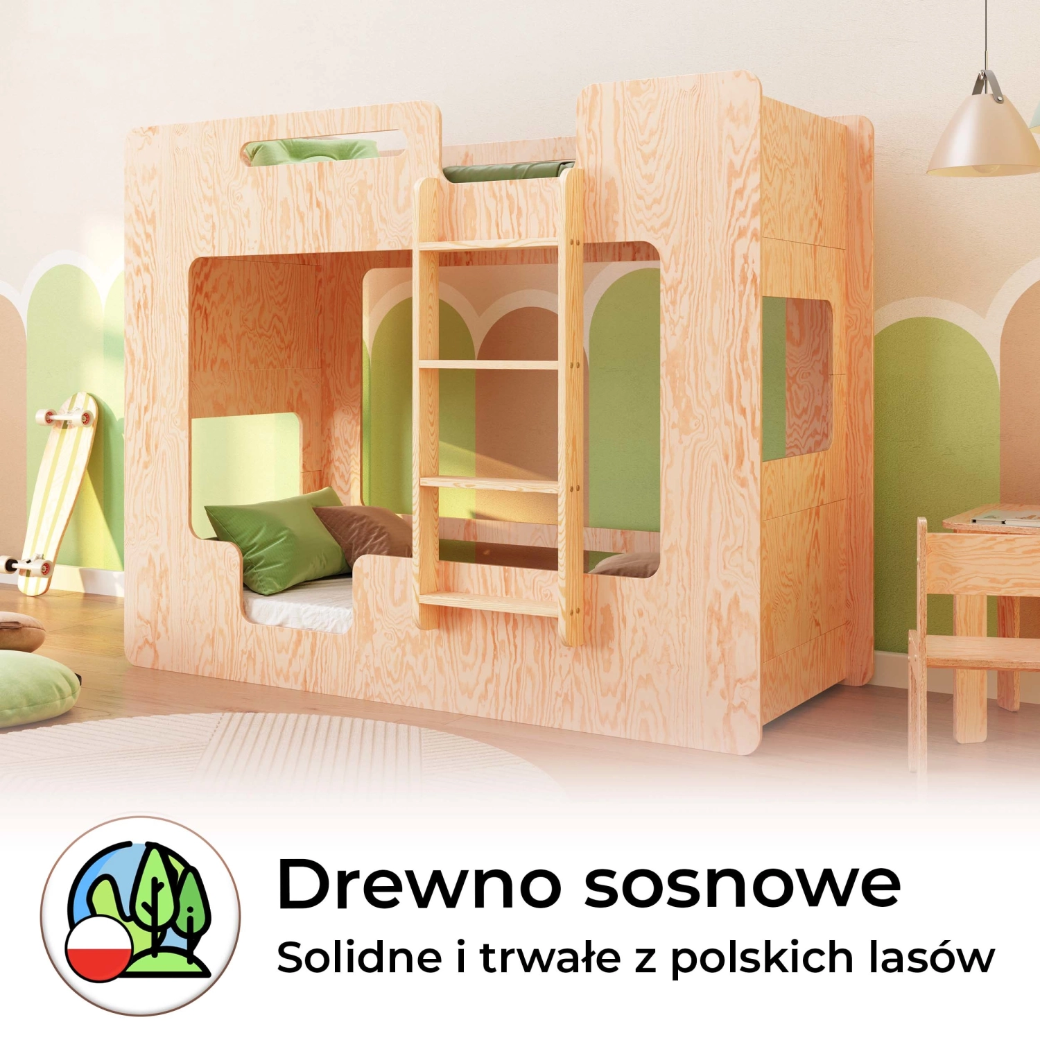 DOKŁADNE WYMIARYŁóżko piętrowe dla dzieci z barierkami i stelażem MIMI B Montessori Drewniane