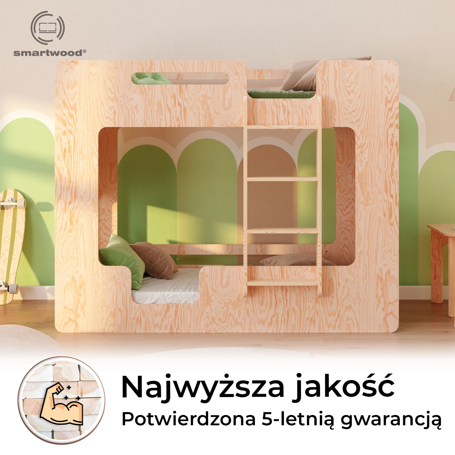 Łóżko piętrowe MIMI B to wyjątkowe rozwiązanie dla dzieci, łączące bezpieczeństwo z niepowtarzalnym designem. Okna po bokach nadają łóżku przytulnego klimatu i tworzą przestrzeń do kreatywnej zabawy, inspirując dzieci do kreowania własnych opowieści. Dostępne w 11 kolorach i 12 rozmiarach, dzięki czemu umożliwia dopasowanie do indywidualnych potrzeb. Wykonane z wysokiej jakości sklejki sosnowej, posiada solidną konstrukcję z barierkami na obu poziomach oraz zaokrąglonymi krawędziami dla pełnego bezpieczeństwa. Model ten został również doceniony przez niemiecki Instytut Prüfengel i otrzymał prestiżowy certyfikat jakości. Dołączone w zestawie stelaże, o max. obciążeniu do 230 kg, umożliwiają natychmiastowe korzystanie z łóżka po montażu.