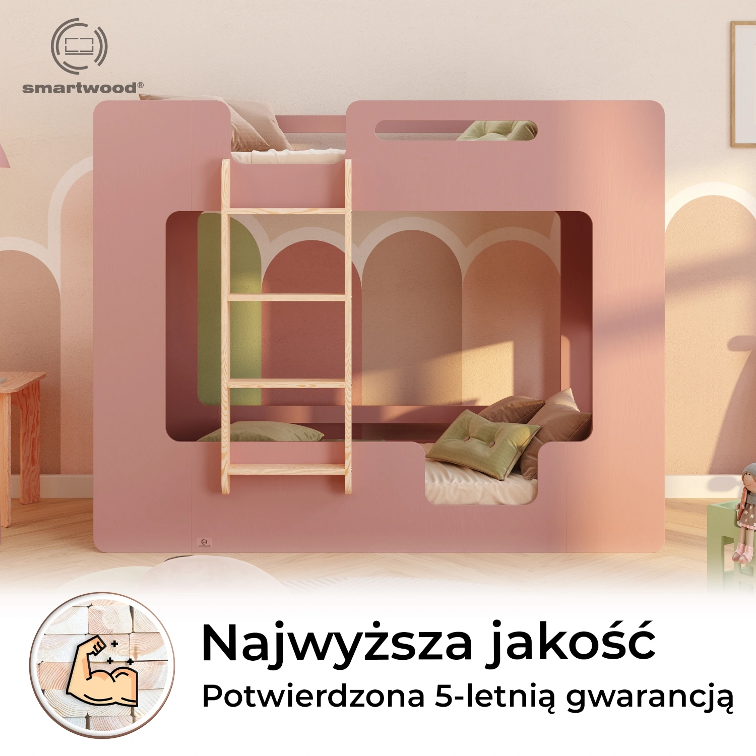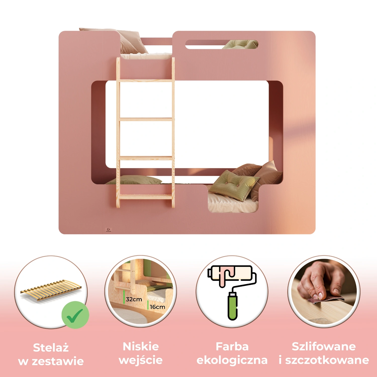 ✔ Podwójna ochrona – barierki na obu poziomach zapewniają poczucie bezpieczeństwa, zarówno na górnym, jak i dolnym łóżku, tworząc komfortową i przytulną przestrzeń do snu.