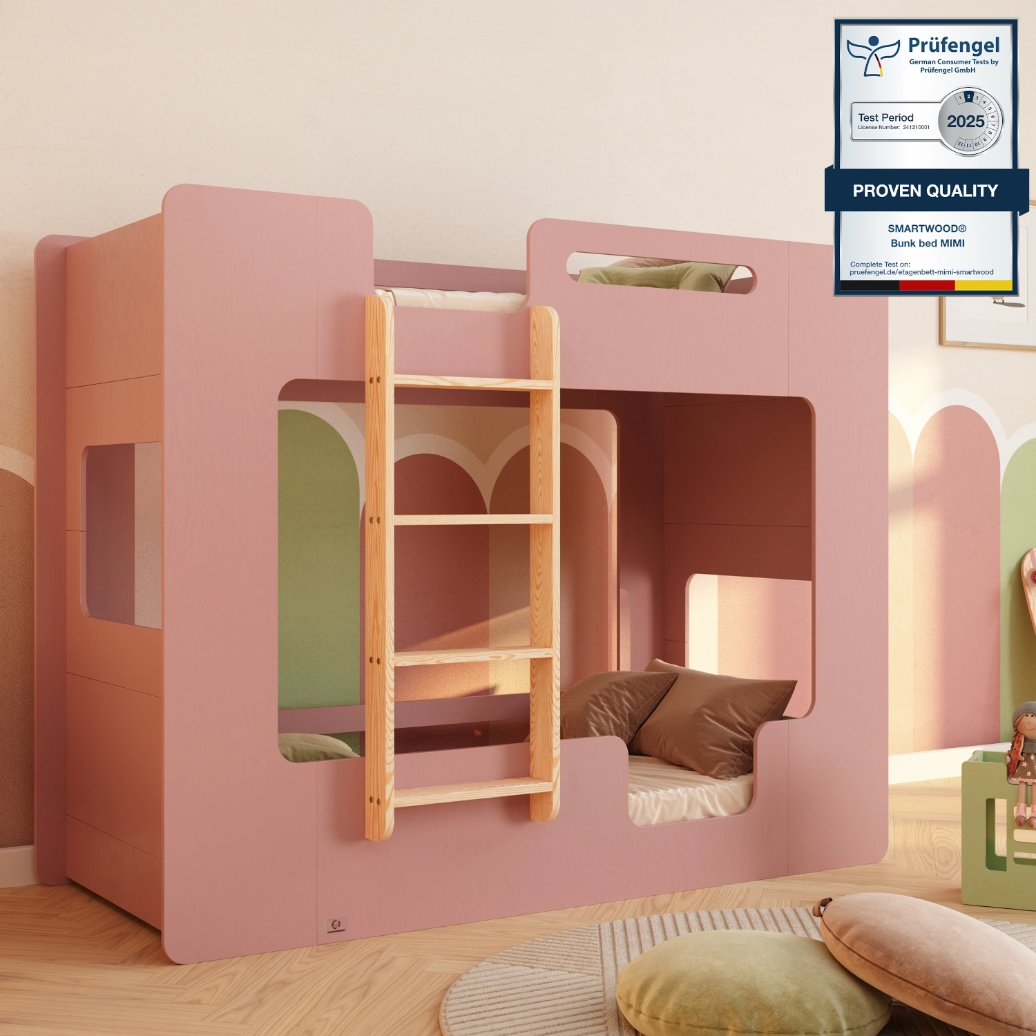 Łóżko piętrowe MIMI B to wyjątkowe rozwiązanie dla dzieci, łączące bezpieczeństwo z niepowtarzalnym designem. Okna po bokach nadają łóżku przytulnego klimatu i tworzą przestrzeń do kreatywnej zabawy, inspirując dzieci do kreowania własnych opowieści. Dostępne w 11 kolorach i 12 rozmiarach, dzięki czemu umożliwia dopasowanie do indywidualnych potrzeb. Wykonane z wysokiej jakości sklejki sosnowej, posiada solidną konstrukcję z barierkami na obu poziomach oraz zaokrąglonymi krawędziami dla pełnego bezpieczeństwa. Model ten został również doceniony przez niemiecki Instytut Prüfengel i otrzymał prestiżowy certyfikat jakości. Dołączone w zestawie stelaże, o max. obciążeniu do 230 kg, umożliwiają natychmiastowe korzystanie z łóżka po montażu.