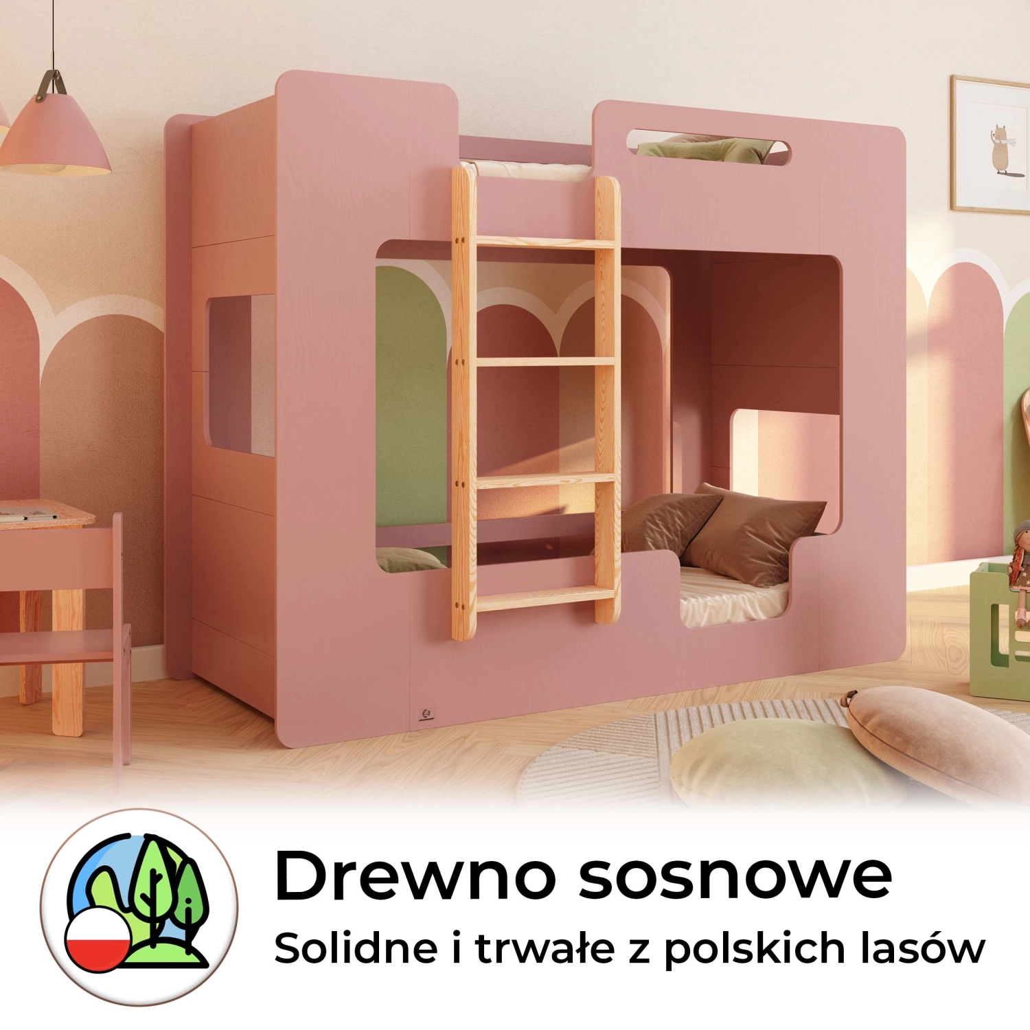 MIMI B to piętrowe łóżko, które łączy funkcjonalność z troską o bezpieczeństwo najmłodszych. Stwórz przyjazne i praktyczne miejsce do snu i zabawy dla swoich dzieci!