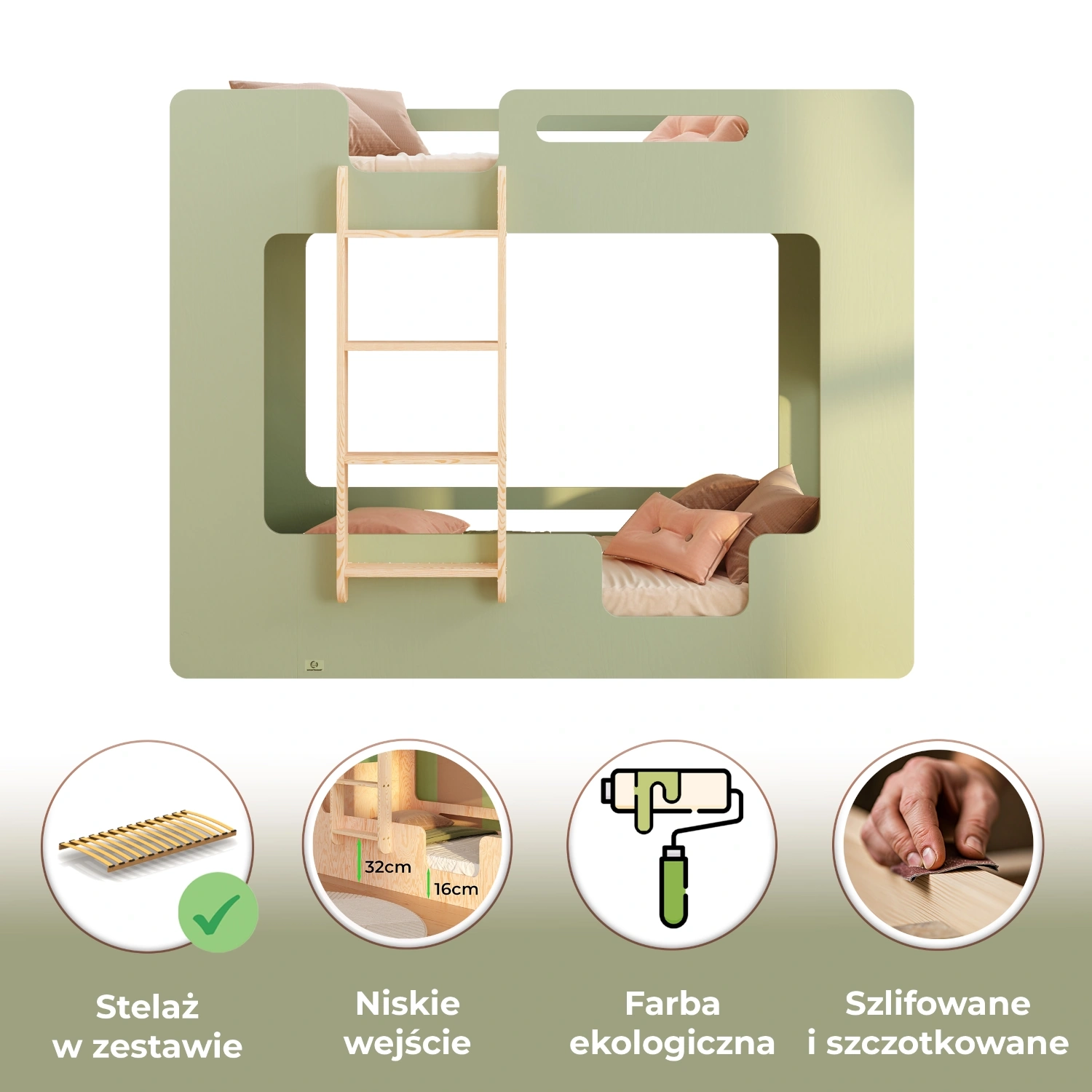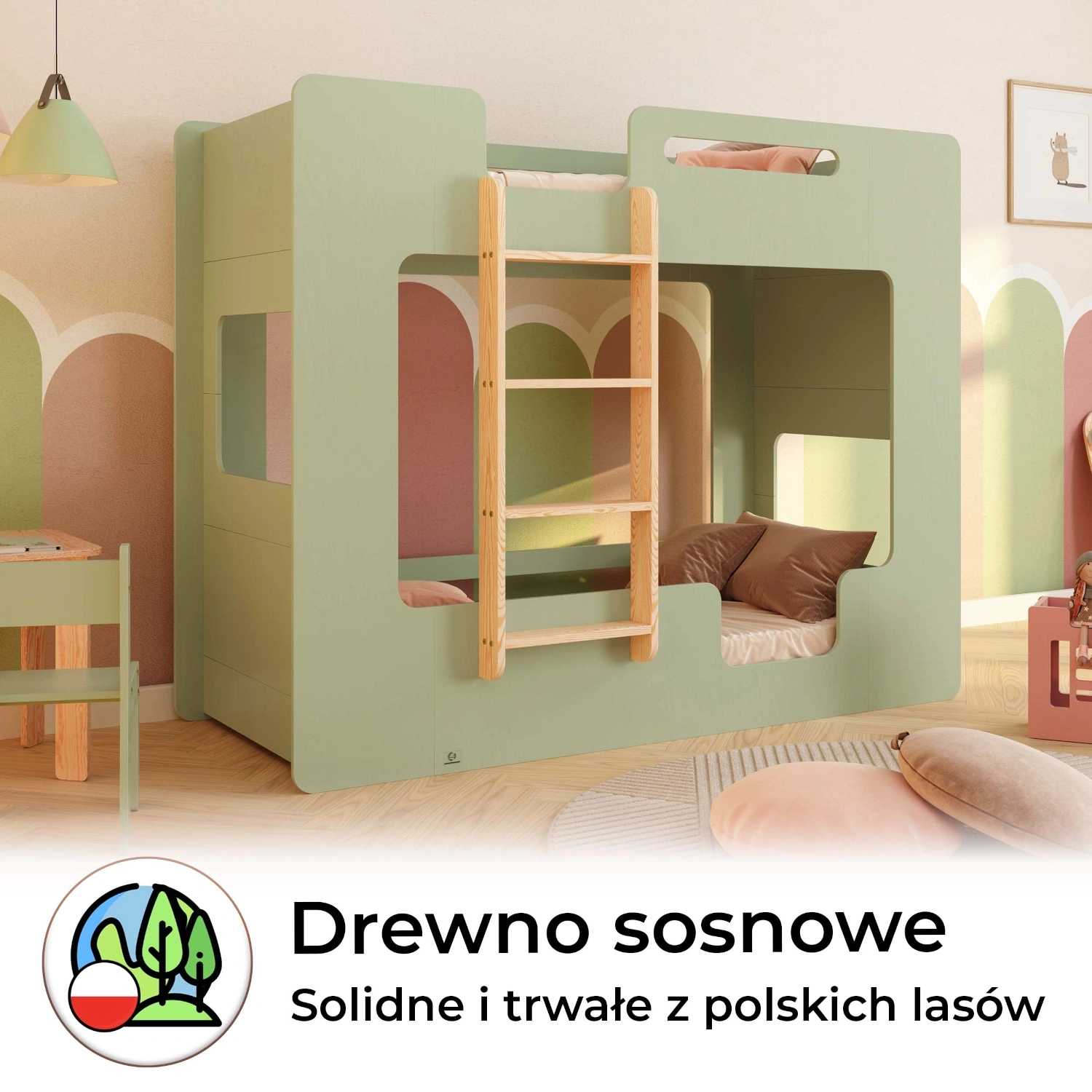 DOKŁADNE WYMIARYŁóżko piętrowe dla dzieci z barierkami i stelażem MIMI B Montessori Drewniane