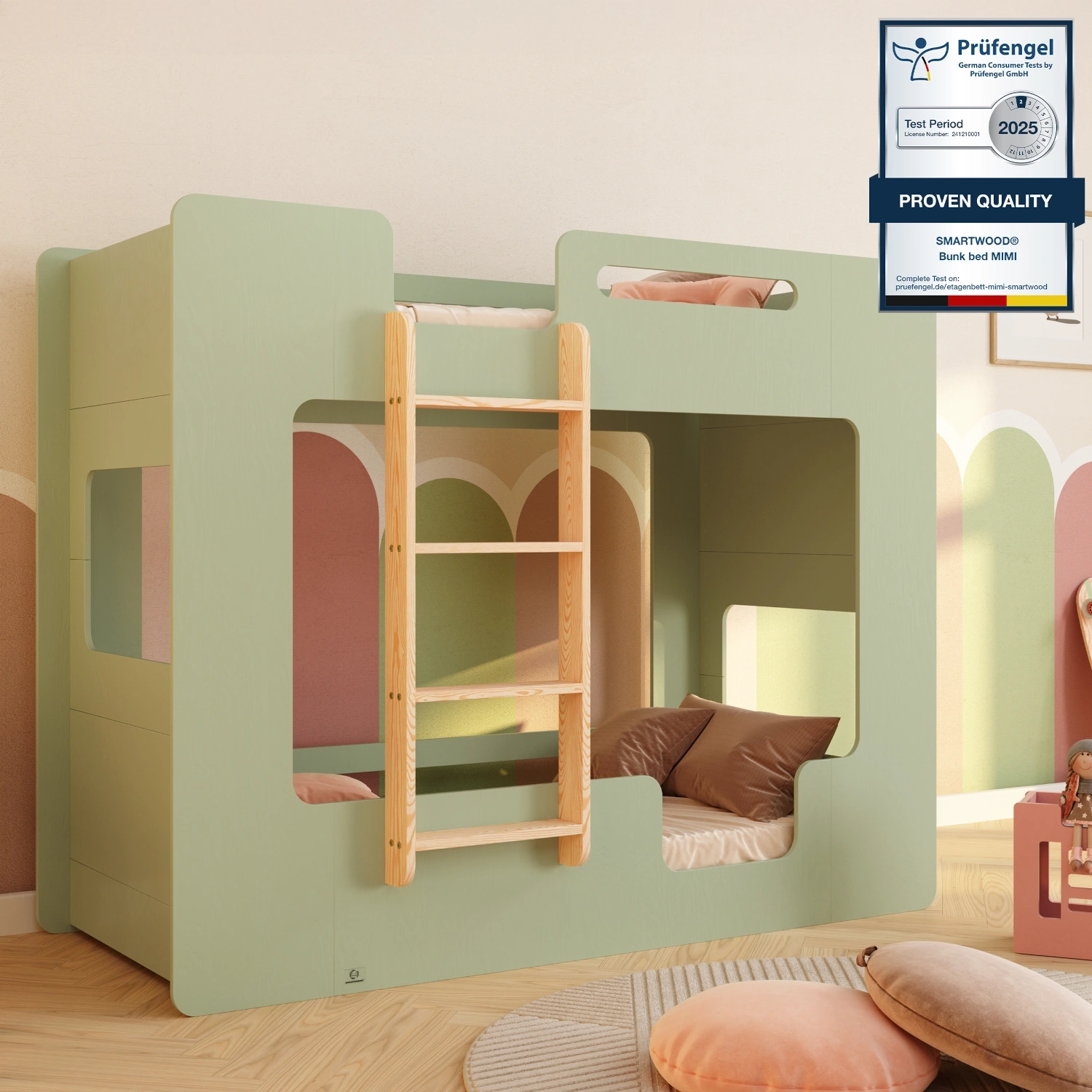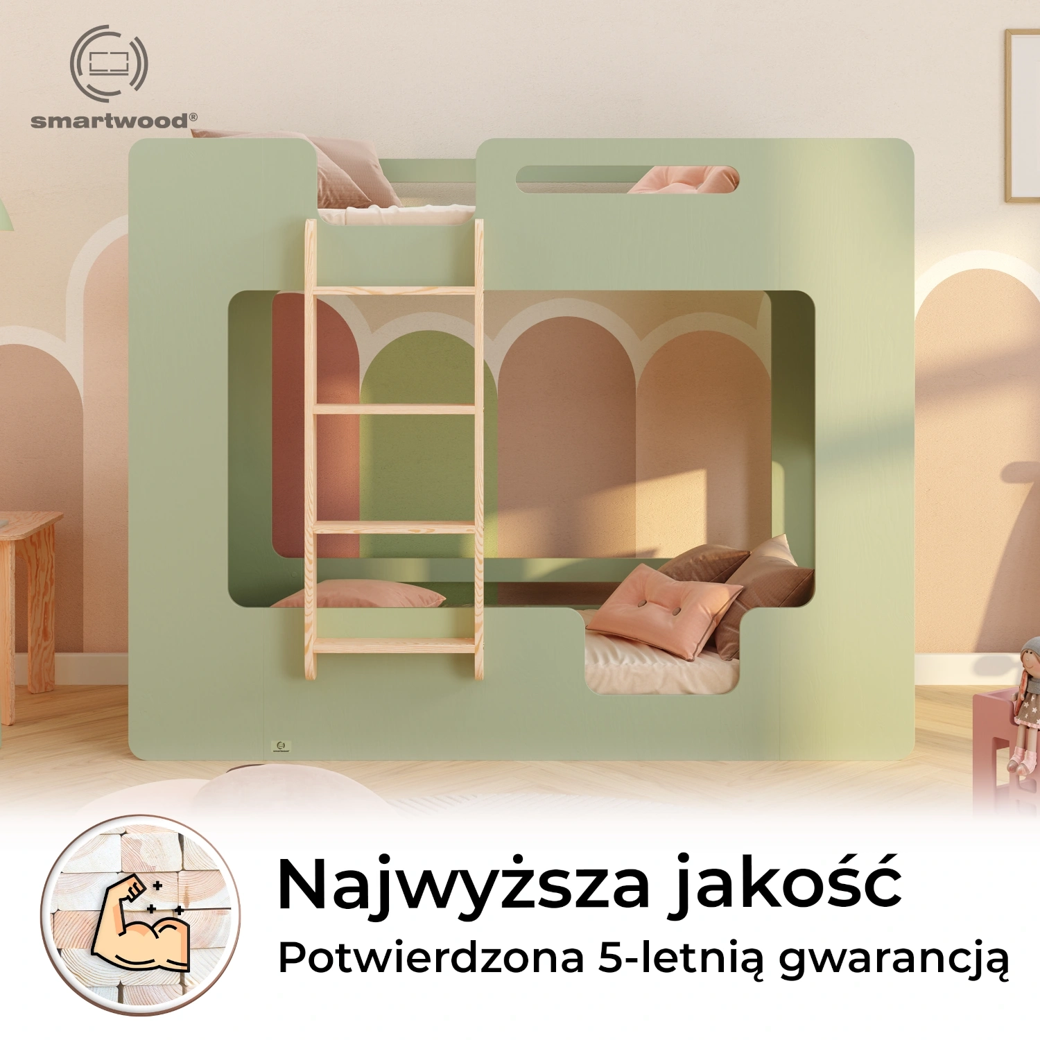 Łóżko piętrowe MIMI B to wyjątkowe rozwiązanie dla dzieci, łączące bezpieczeństwo z niepowtarzalnym designem. Okna po bokach nadają łóżku przytulnego klimatu i tworzą przestrzeń do kreatywnej zabawy, inspirując dzieci do kreowania własnych opowieści. Dostępne w 11 kolorach i 12 rozmiarach, dzięki czemu umożliwia dopasowanie do indywidualnych potrzeb. Wykonane z wysokiej jakości sklejki sosnowej, posiada solidną konstrukcję z barierkami na obu poziomach oraz zaokrąglonymi krawędziami dla pełnego bezpieczeństwa. Model ten został również doceniony przez niemiecki Instytut Prüfengel i otrzymał prestiżowy certyfikat jakości. Dołączone w zestawie stelaże, o max. obciążeniu do 230 kg, umożliwiają natychmiastowe korzystanie z łóżka po montażu.