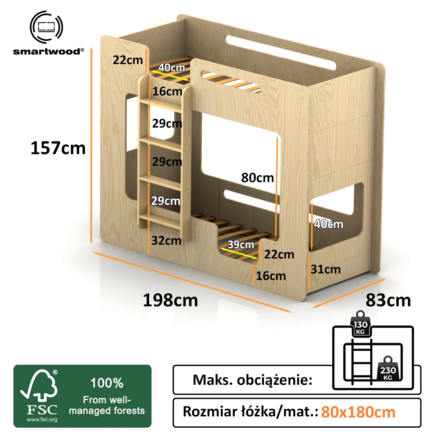 ✔ Wytrzymałość dostosowana do potrzeb – dolne łóżko z nośnością do 230 kg idealnie sprawdzi się dla aktywnych maluchów, podczas gdy górne z obciążeniem do 130 kg oferuje stabilność i ochronę podczas snu.