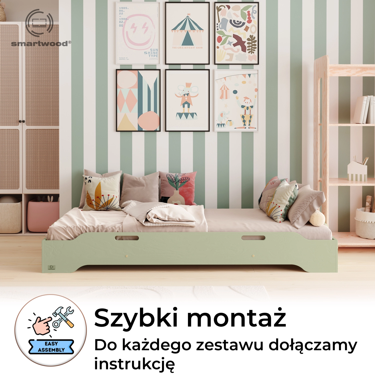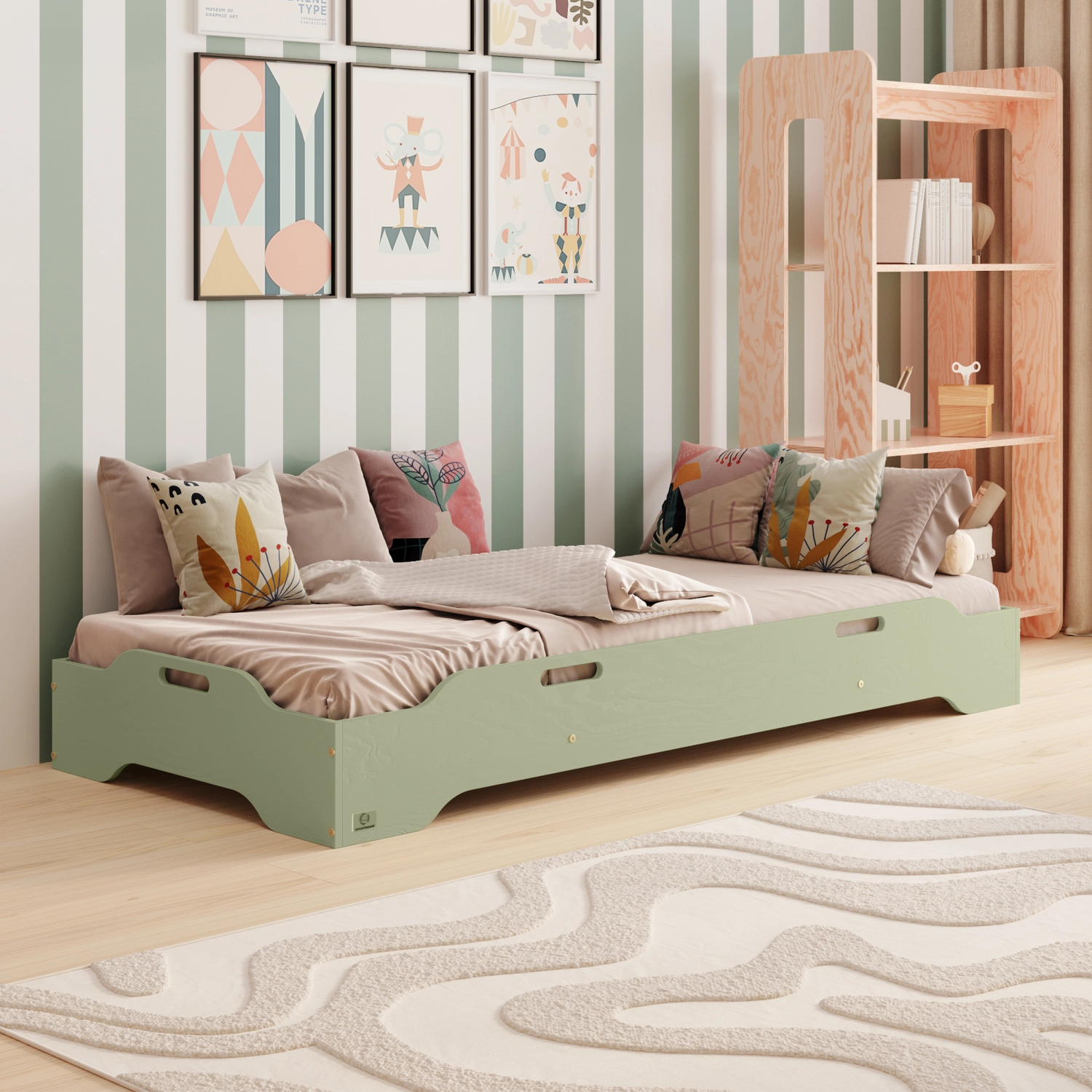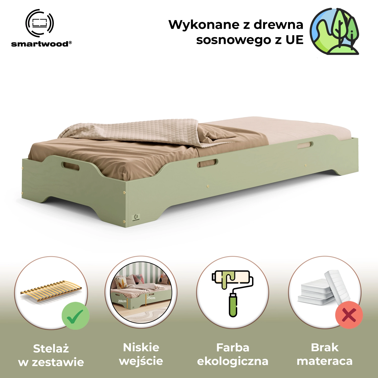 Łóżko pojedyncze dla dzieci podłogowe ze stelażem TILA 8 Montessori Drewniane