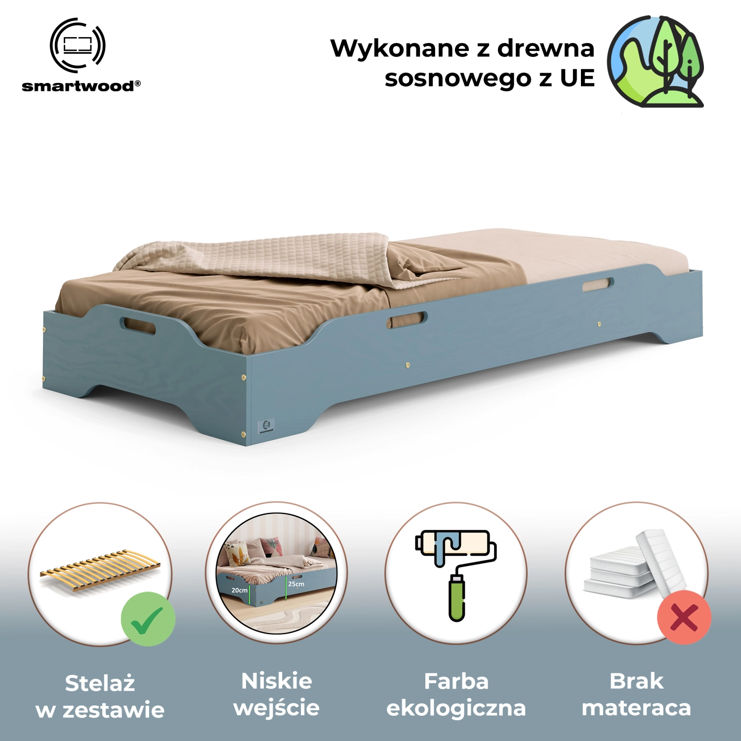 Dla tych, którzy potrzebują więcej przestrzeni w ciągu dnia mamy następujące rozwiązanie - to łóżko pozwala na wygodne piętrowanie – można układać kilka łóżek jedno na drugim, a na noc łatwo je rozstawić. Dzięki idealnie dopasowanym krawędziom każda konfiguracja jest stabilna i bezpieczna. Można również wykorzystać je jako podwyższenie innego łóżka, tworząc wielopoziomowe rozwiązanie bez wiercenia i skomplikowanego montażu. To elastyczność, jakiej potrzebujesz w nowoczesnym wnętrzu!