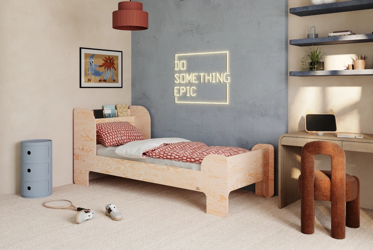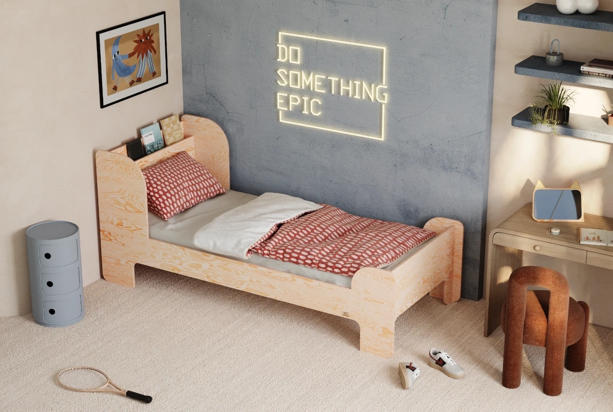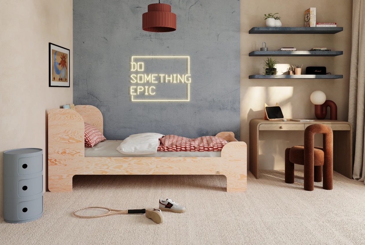 Masz dość nudnych mebli? Nasze łóżko to połączenie solidnej sklejki sosnowej z młodzieżowym vibe’em. Gładkie, zaokrąglone krawędzie chronią przed otarciami, a stonowana estetyka wpasuje się w każdy nastoletni pokój.