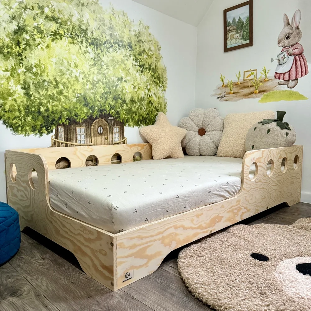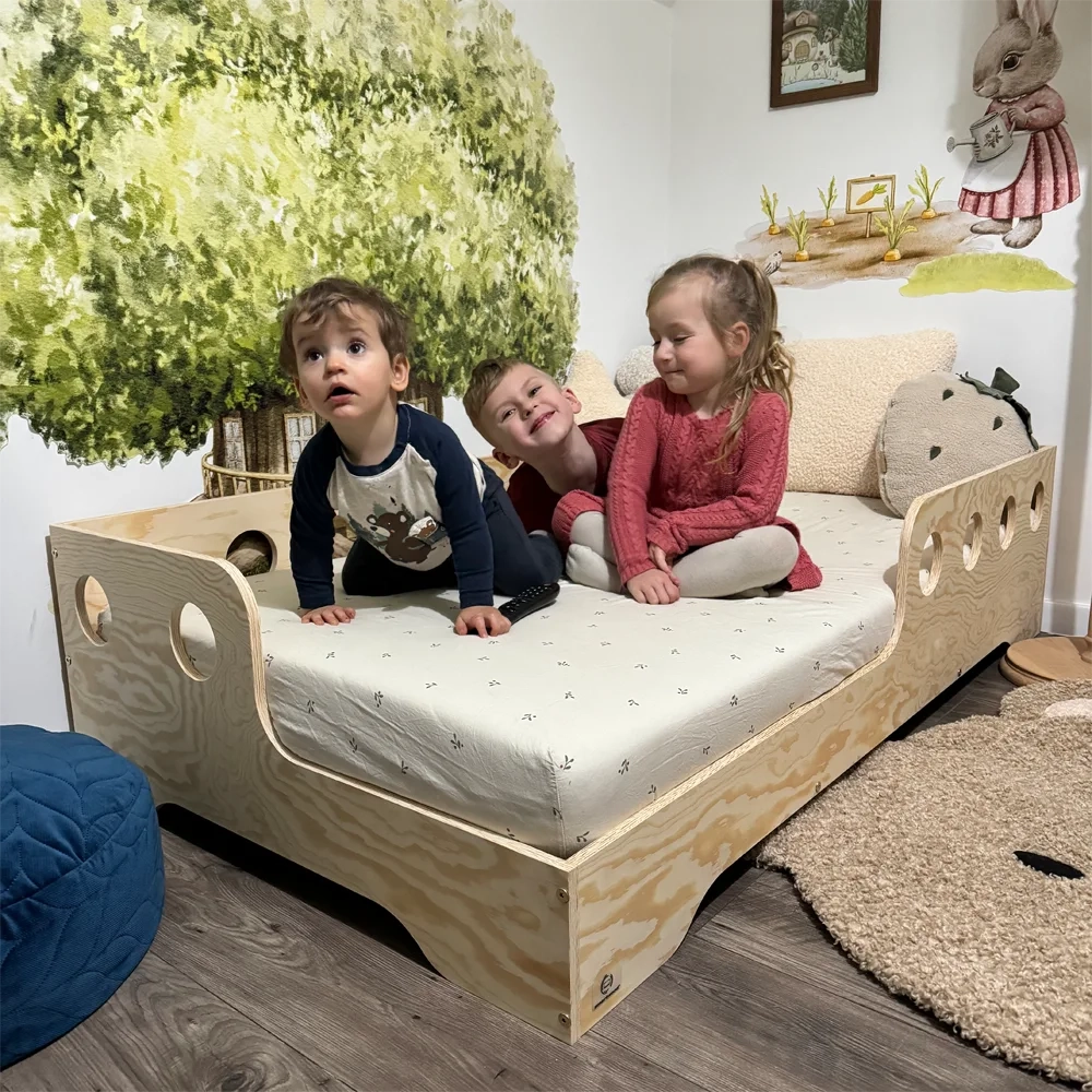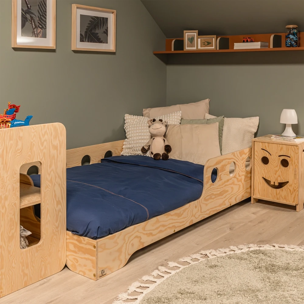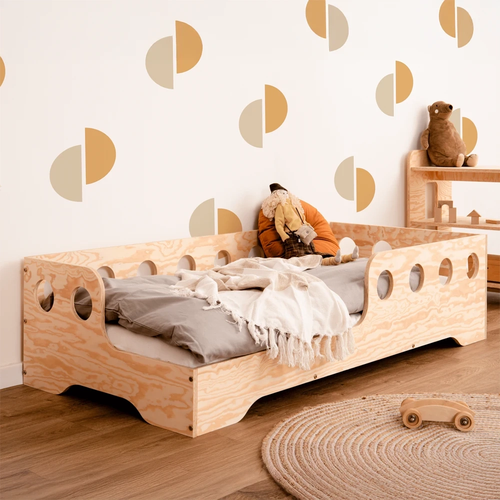 Łóżko pojedyncze dla dzieci z barierką i stelażem TILA 5 Montessori Drewniane