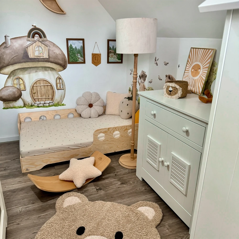 Przemyślana konstrukcja łóżka nie tylko emanuje solidnością, ale również prezentuje gładkie i delikatnie zaokrąglone krawędzie, które dodają estetyki oraz zapewniają pełne bezpieczeństwo i wygodę użytkowania.