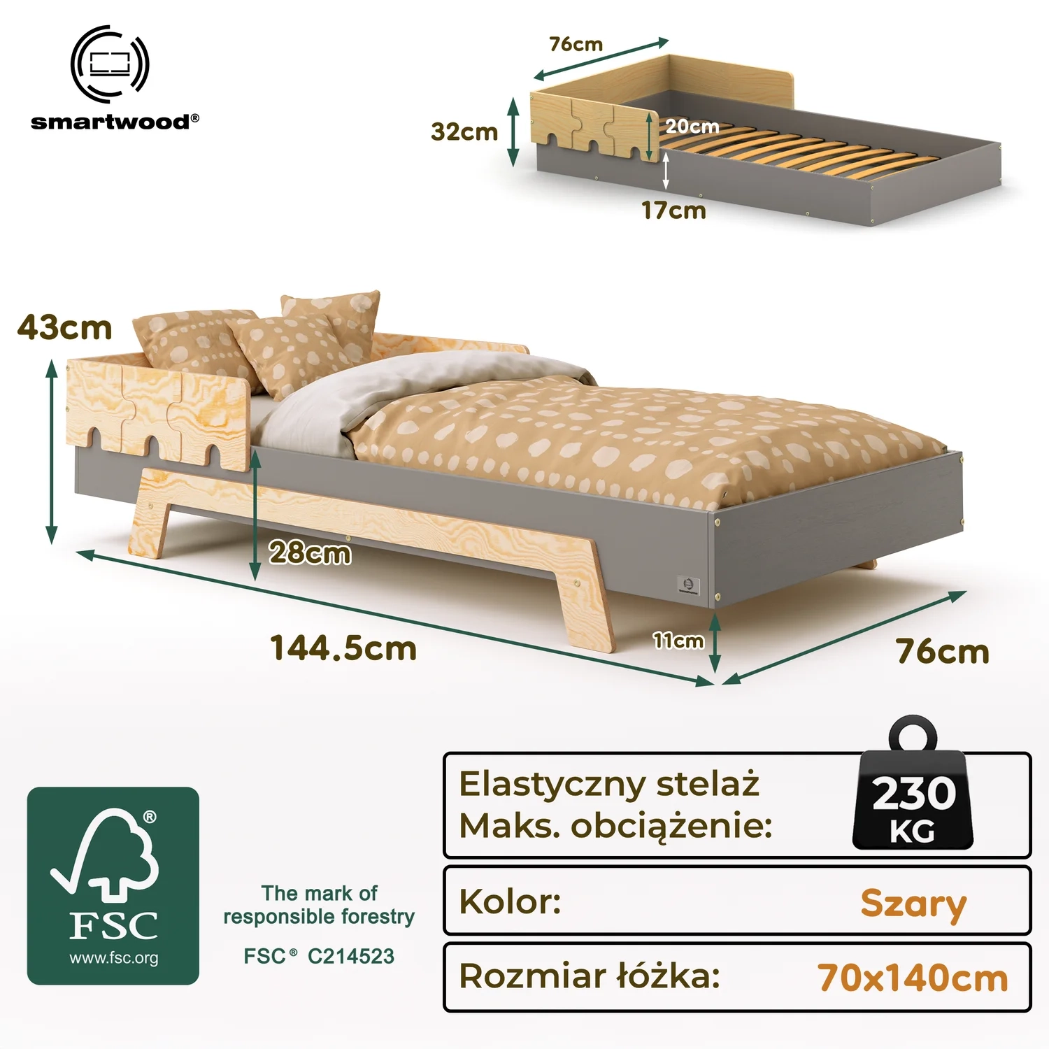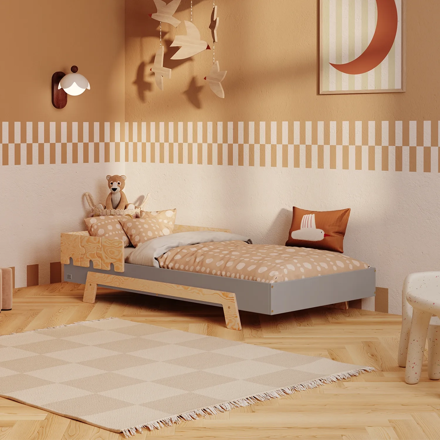 Łóżko pojedyncze dla dzieci z barierką i stelażem PUZZLE BR1 Montessori Drewniane