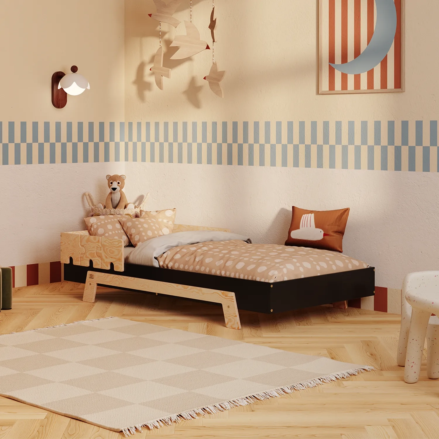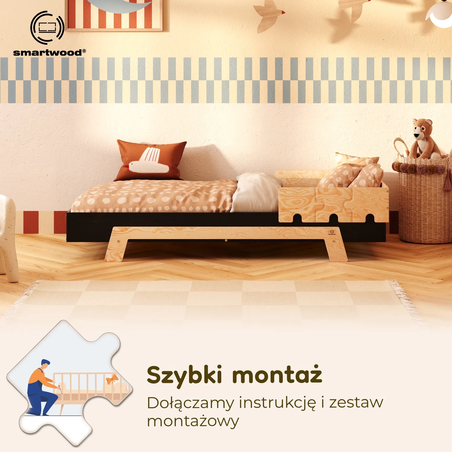 Łóżko pojedyncze dla dzieci z barierką i stelażem PUZZLE BR1 Montessori Drewniane