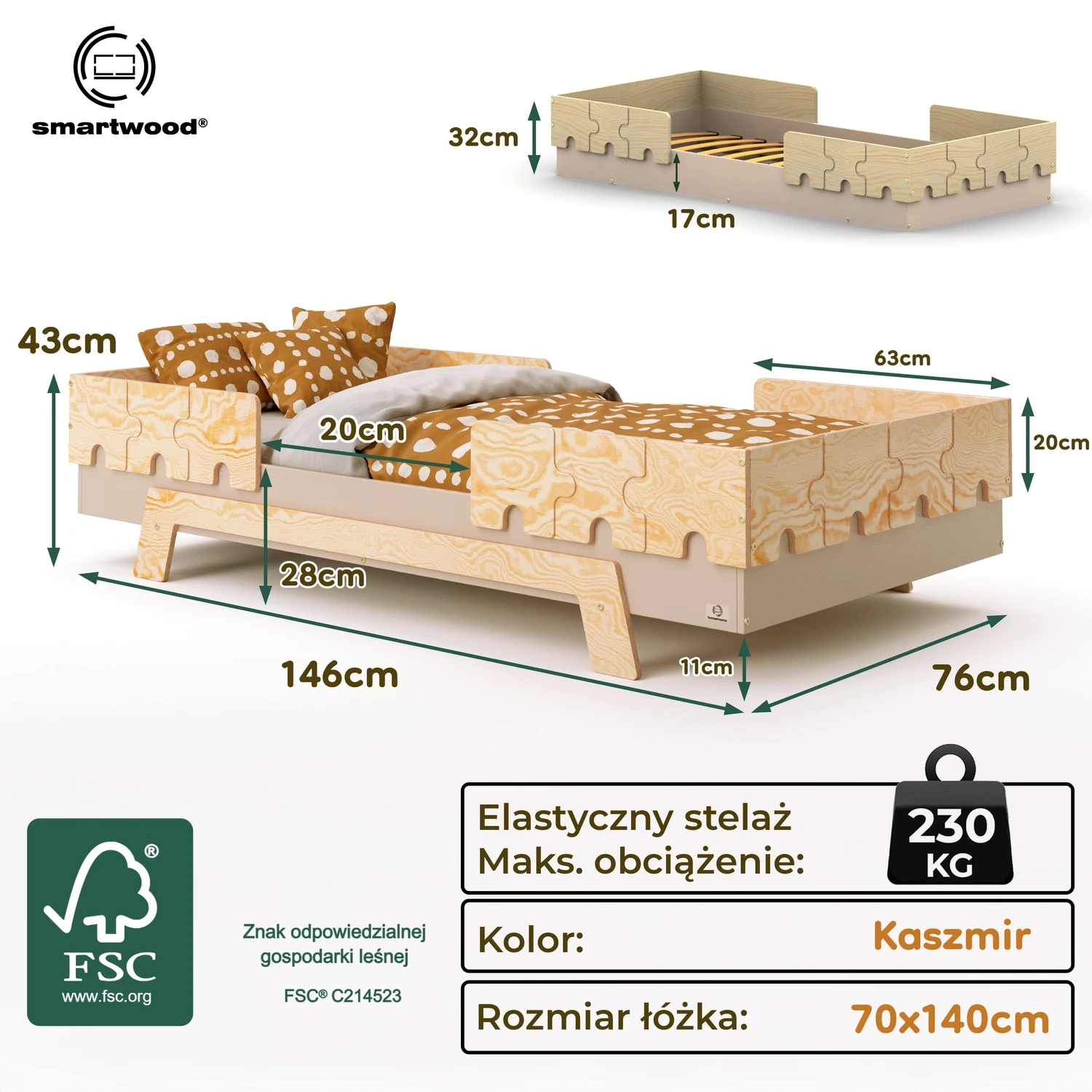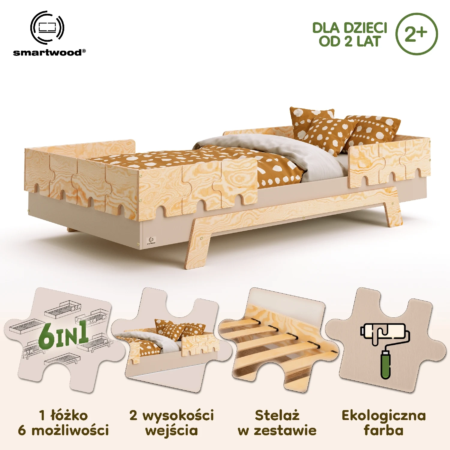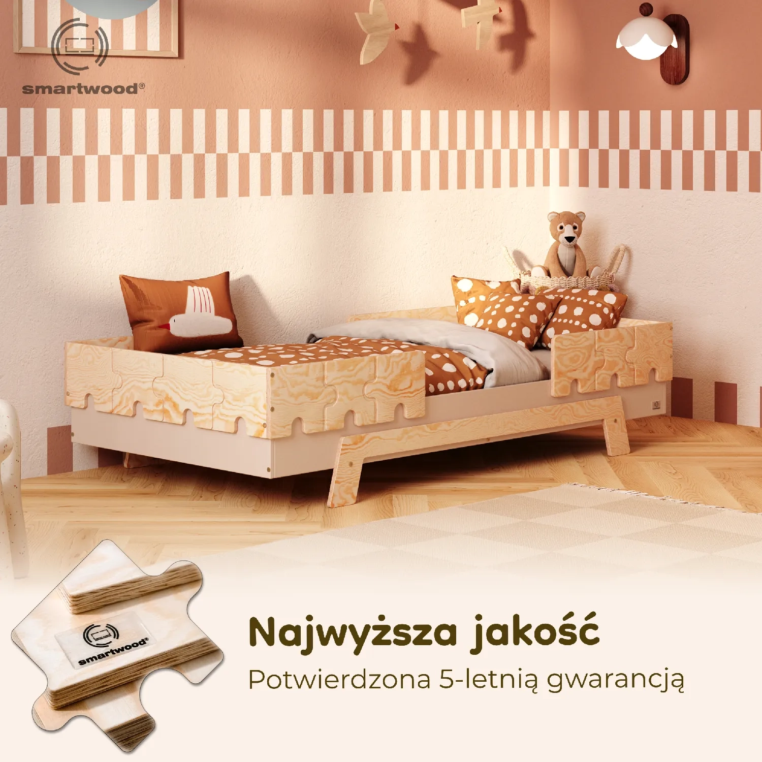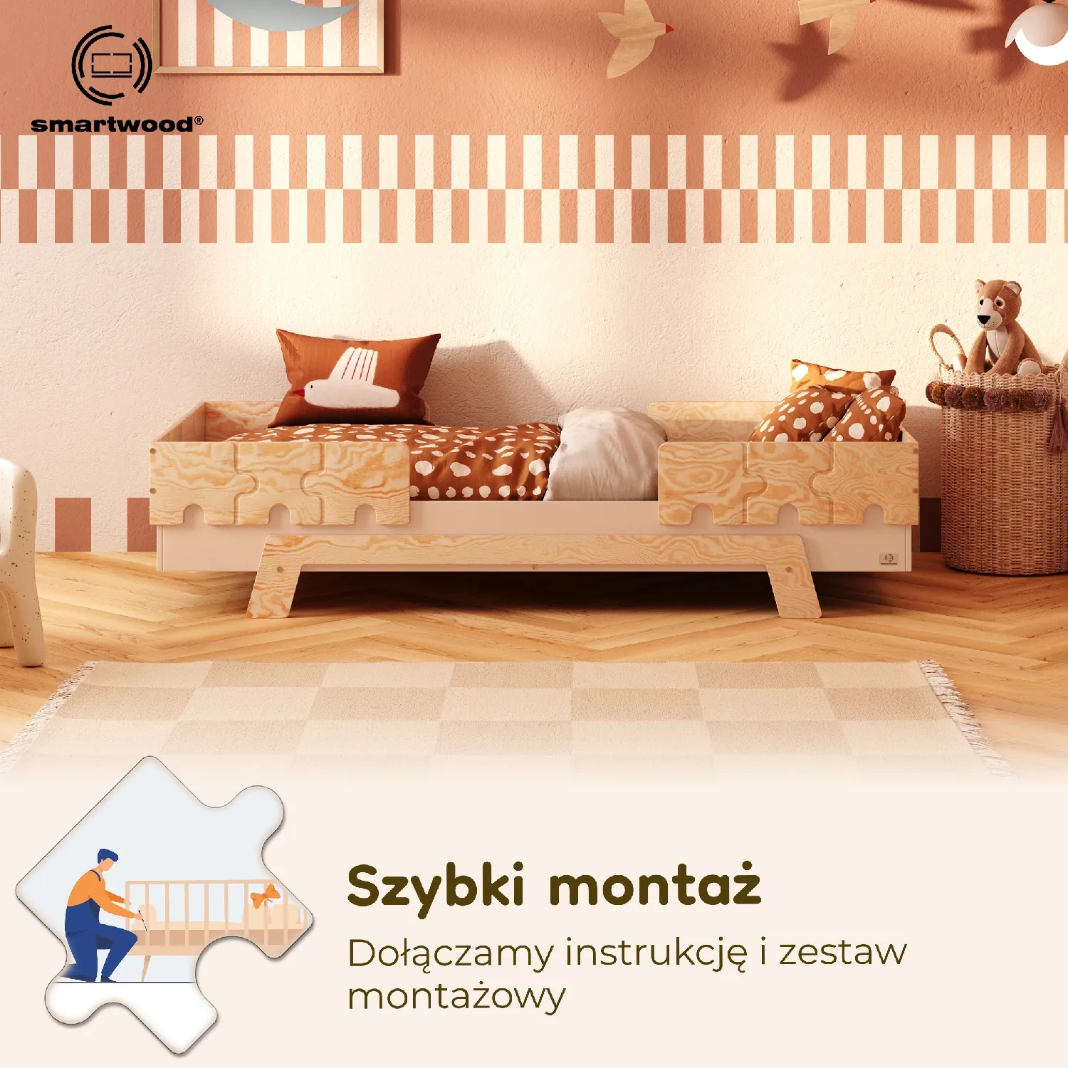 Łóżko pojedyncze dla dzieci z barierkami i stelażem PUZZLE BR2 Montessori Drewniane