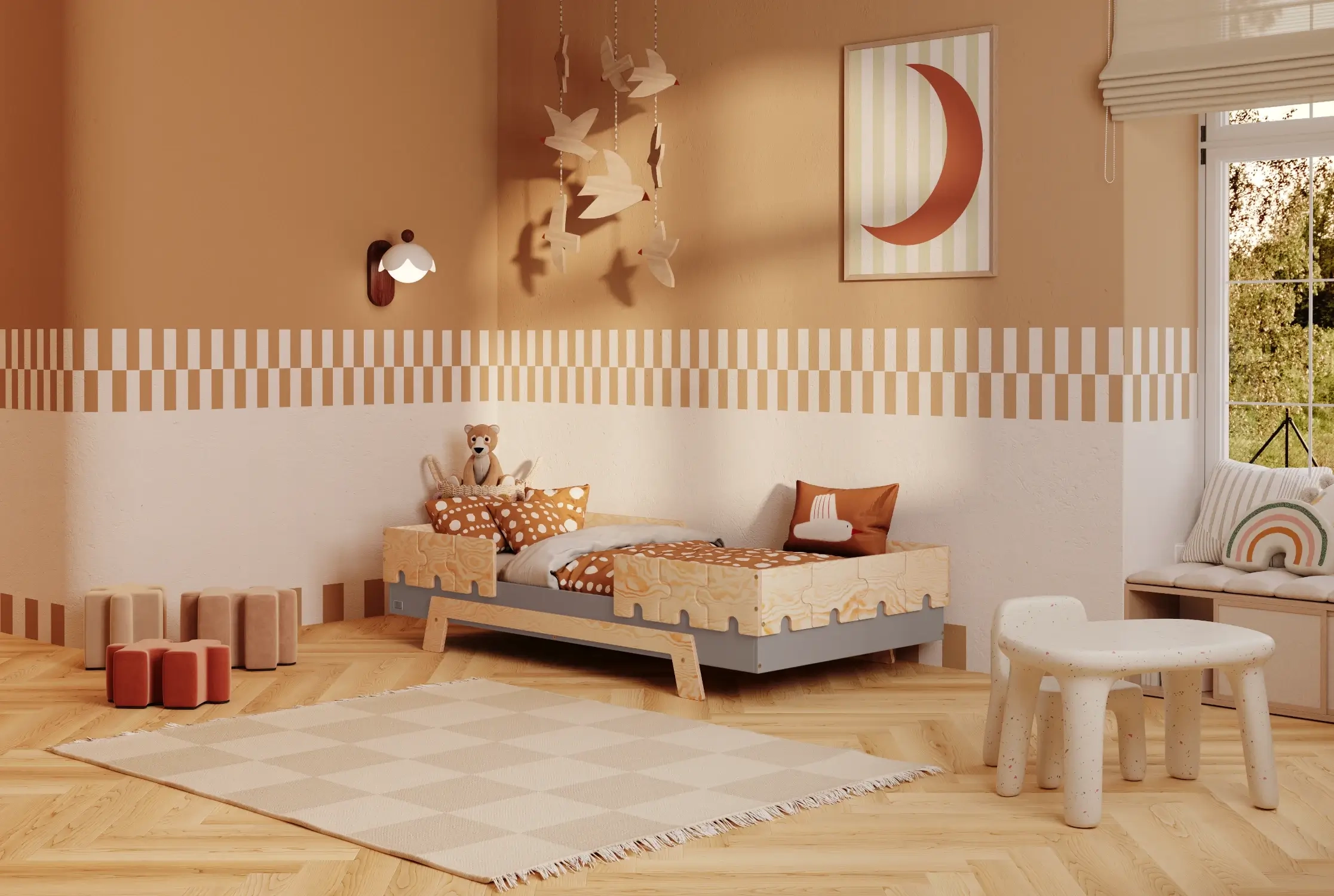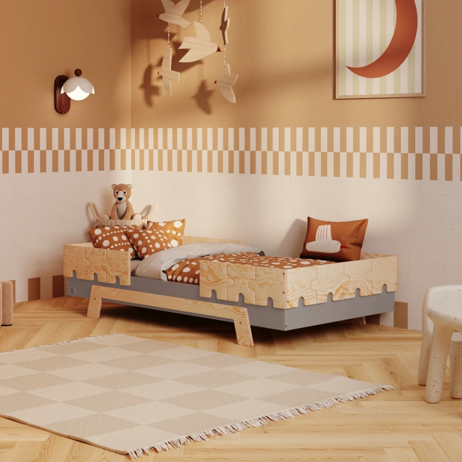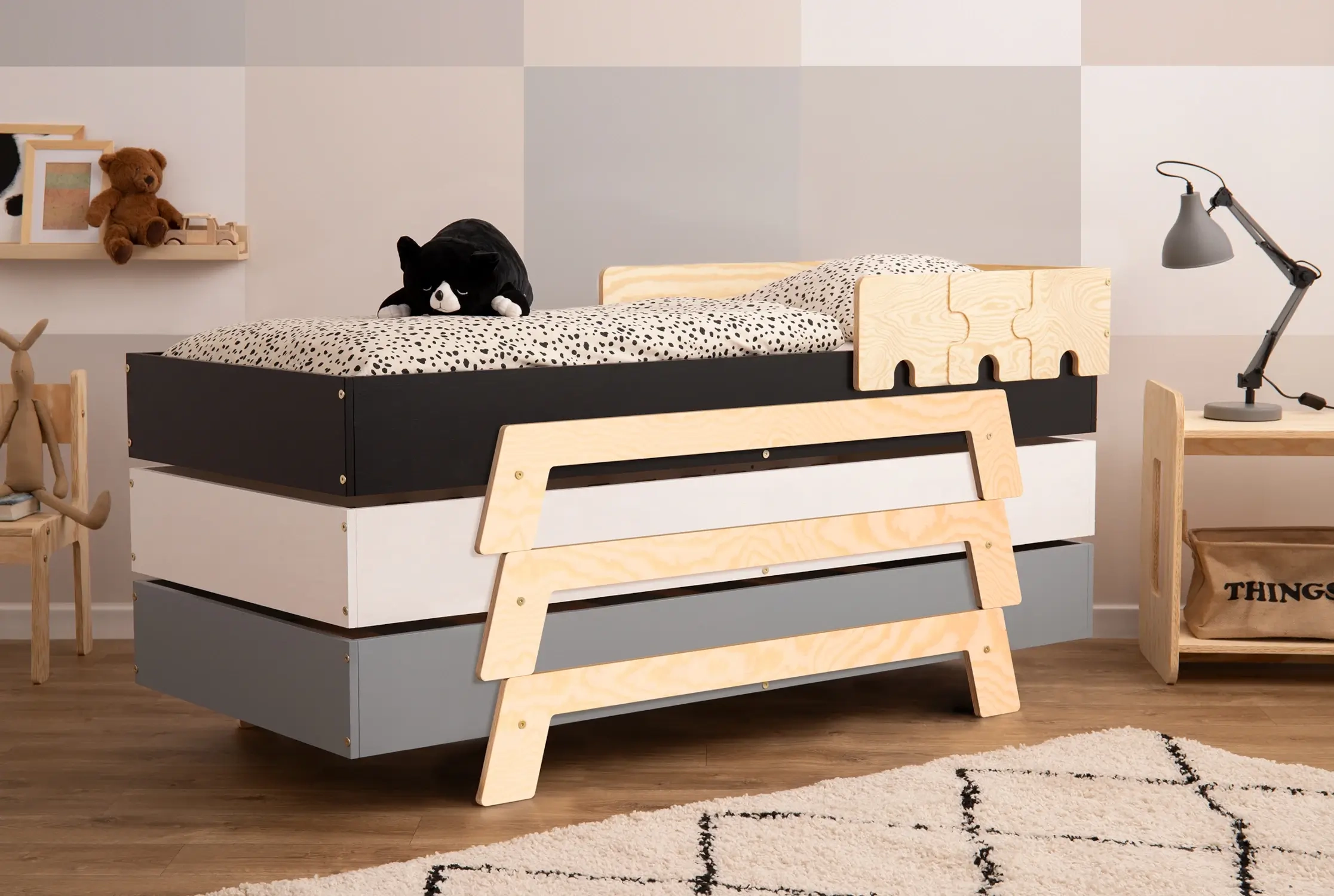 Łóżko Puzzle to modułowy mebel, który dopasujesz do wieku, temperamentu i etapu rozwoju dziecka. Charakterystyczne barierki w kształcie puzzli nie tylko pięknie wyglądają, ale przede wszystkim dbają o bezpieczeństwo – zwłaszcza u najmłodszych, bardzo ruchliwych maluchów.
