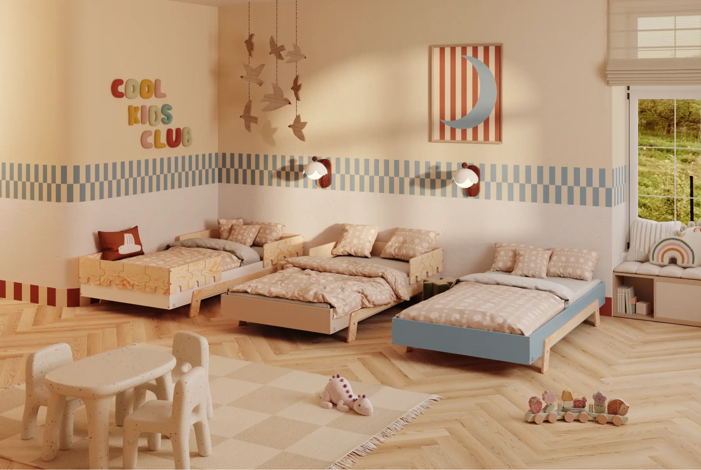 Świetna baza do stworzenia minimalistycznego kącika do spania lub strefy relaksu. Niska konstrukcja nadal sprzyja bezpieczeństwu, ale daje pełną swobodę ruchu.