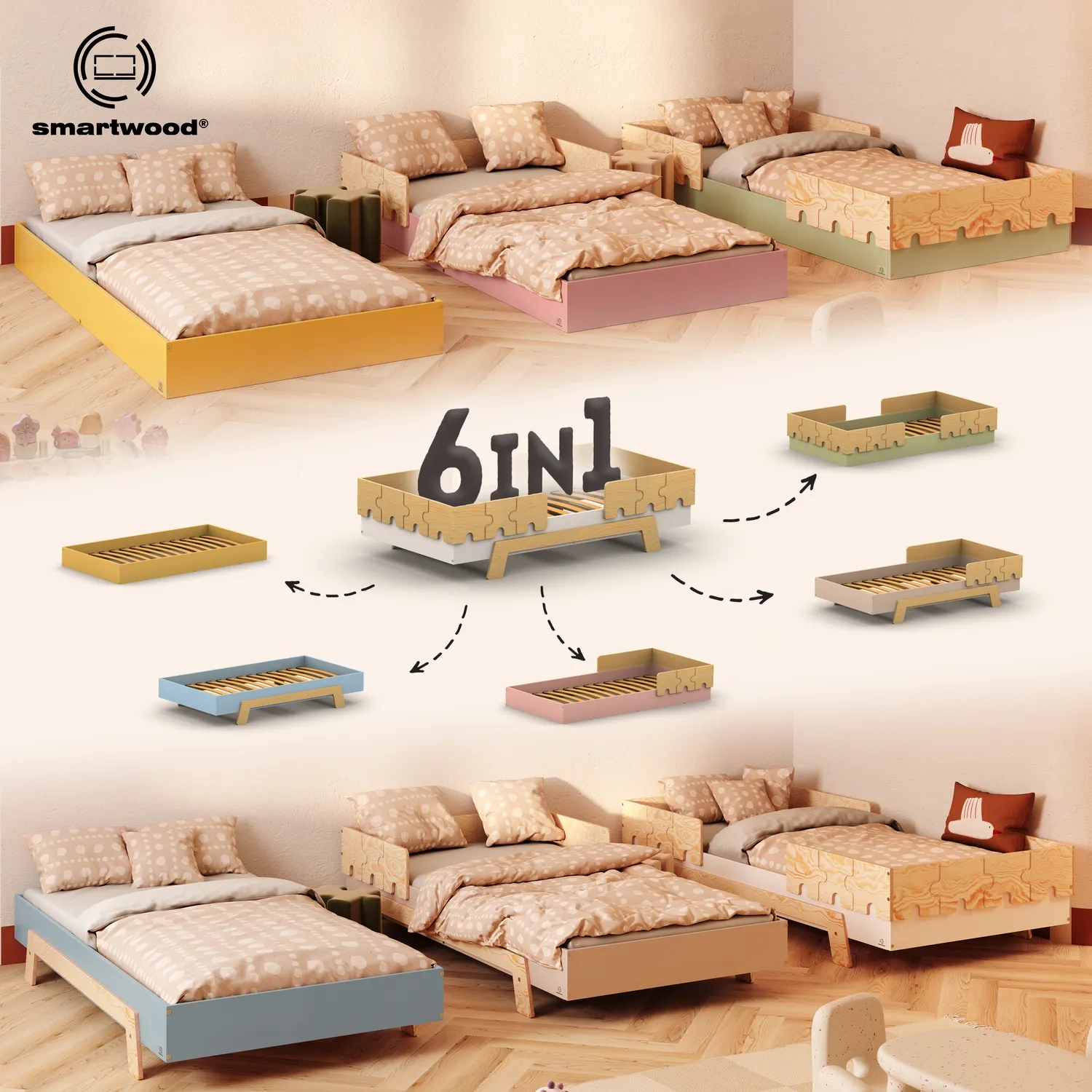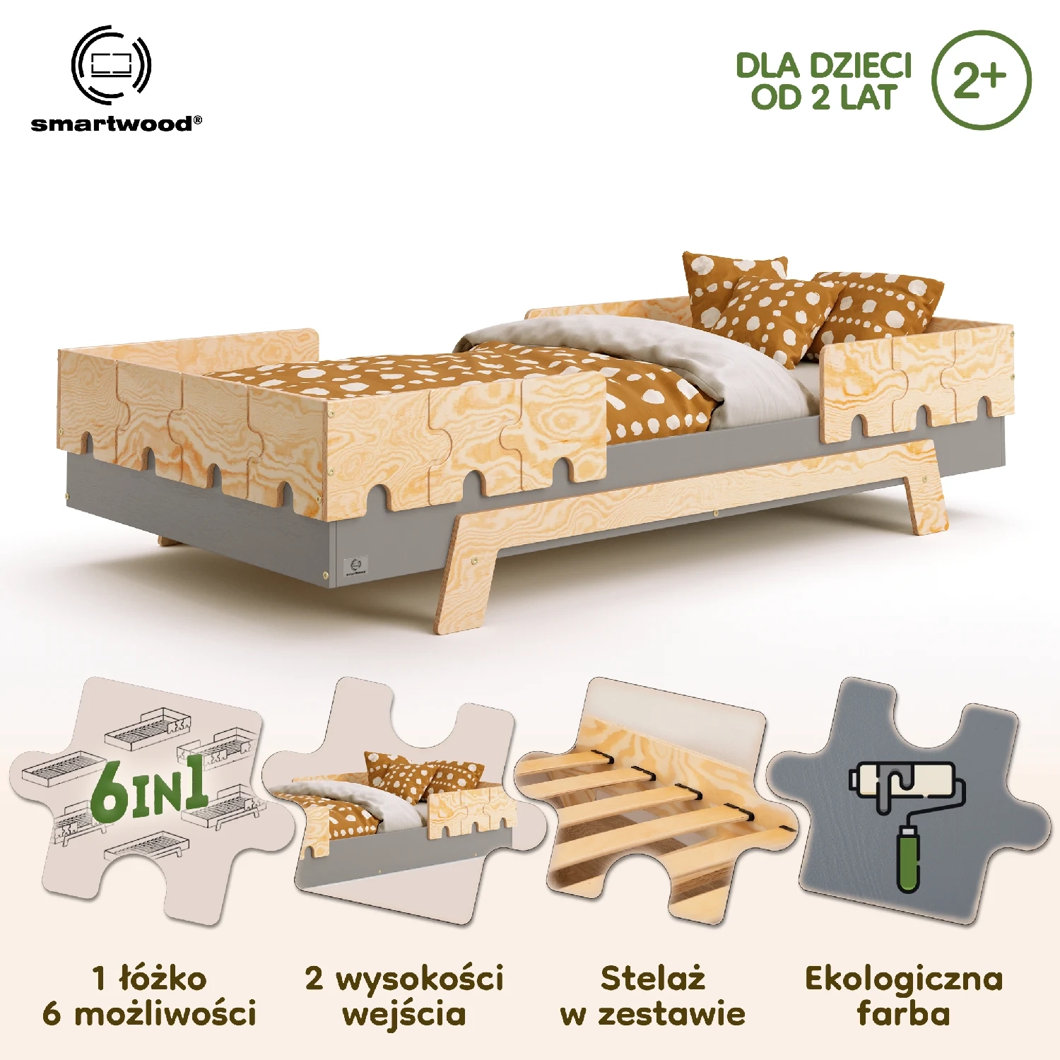 Dzięki przemyślanej konstrukcji możesz wybrać spośród 6 wariantów, różniących się liczbą barierek oraz wysokością łóżka. W praktyce oznacza to, że jedno łóżko może być zarówno bezpiecznym, podłogowym miejscem snu dla malucha, jak i „dorosłym” łóżkiem dla starszego dziecka.