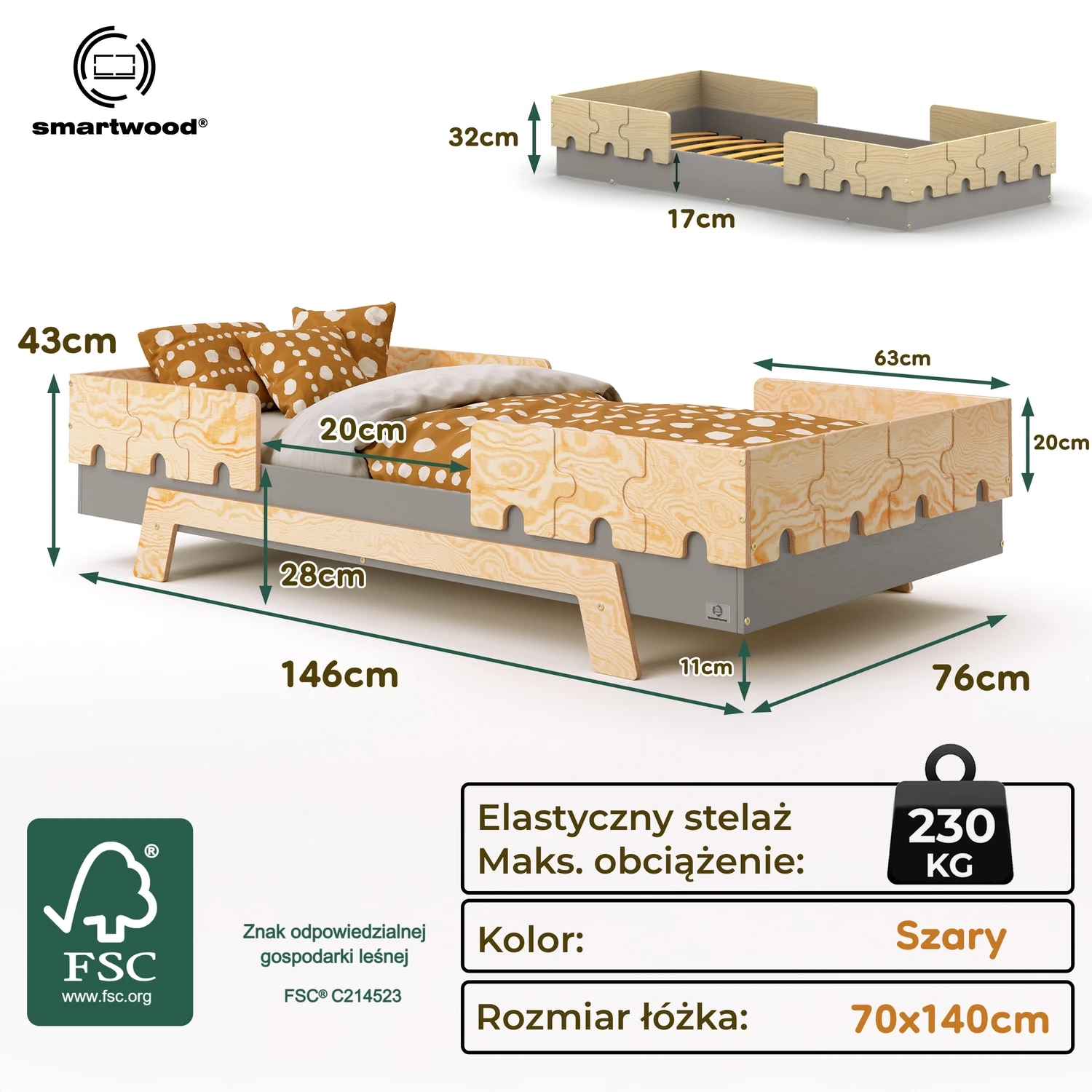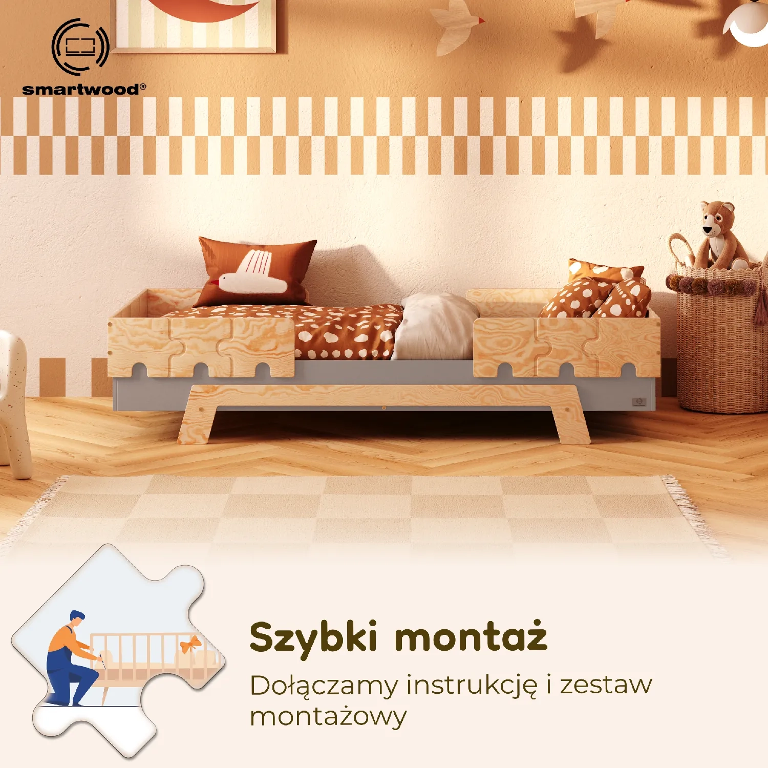 Najbardziej rozbudowany wariant: dwie barierki + nogi. To propozycja dla rodziców, którzy stawiają na maksymalne bezpieczeństwo i wygodę. Podwyższony poziom spania oraz barierki w kształcie puzzli chronią dziecko przed wypadnięciem z łóżka, a jednocześnie tworzą wyjątkową, bajkową oprawę pokoju.