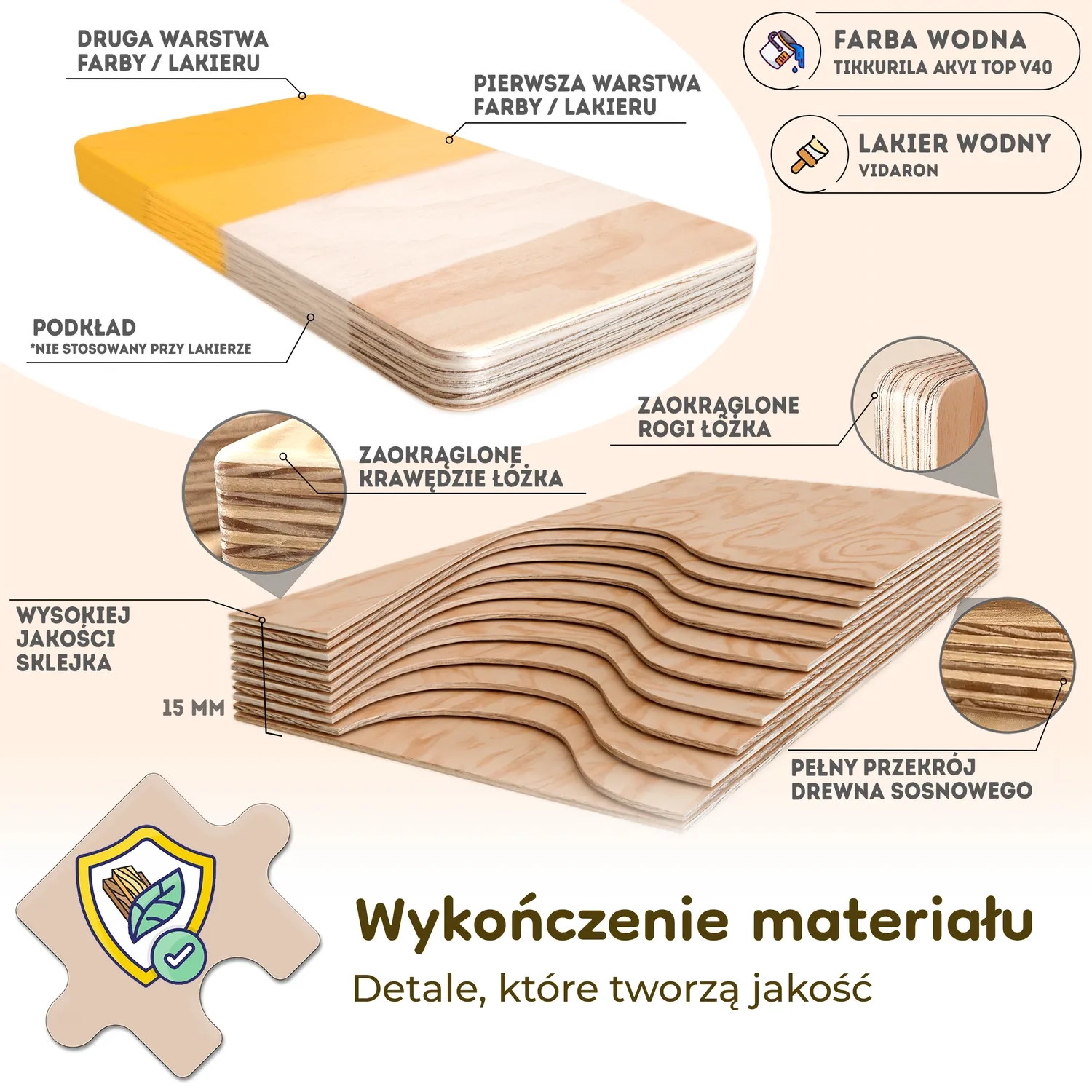 W procesie lakierowania korzystamy z bezbarwnego lakieru do drewna marki VIDARON. Lakier nie tylko podkreśla naturalny kolor drewna, ale również jest specjalnie dostosowany do produktów dziecięcych. Bezpieczny dla najmłodszych, spełnia surowe normy europejskiej normy PN EN 71.3 dotyczącej bezpieczeństwa zabawek. Dzięki temu każdy nasz produkt nie tylko zachowuje estetykę drewna, ale również zapewnia rodzicom pewność, że jest bezpieczny dla ich dzieci. Nasz lakier VIDARON to gwarancja trwałości, ochrony i pięknego wykończenia drewnianych elementów naszych produktów.
