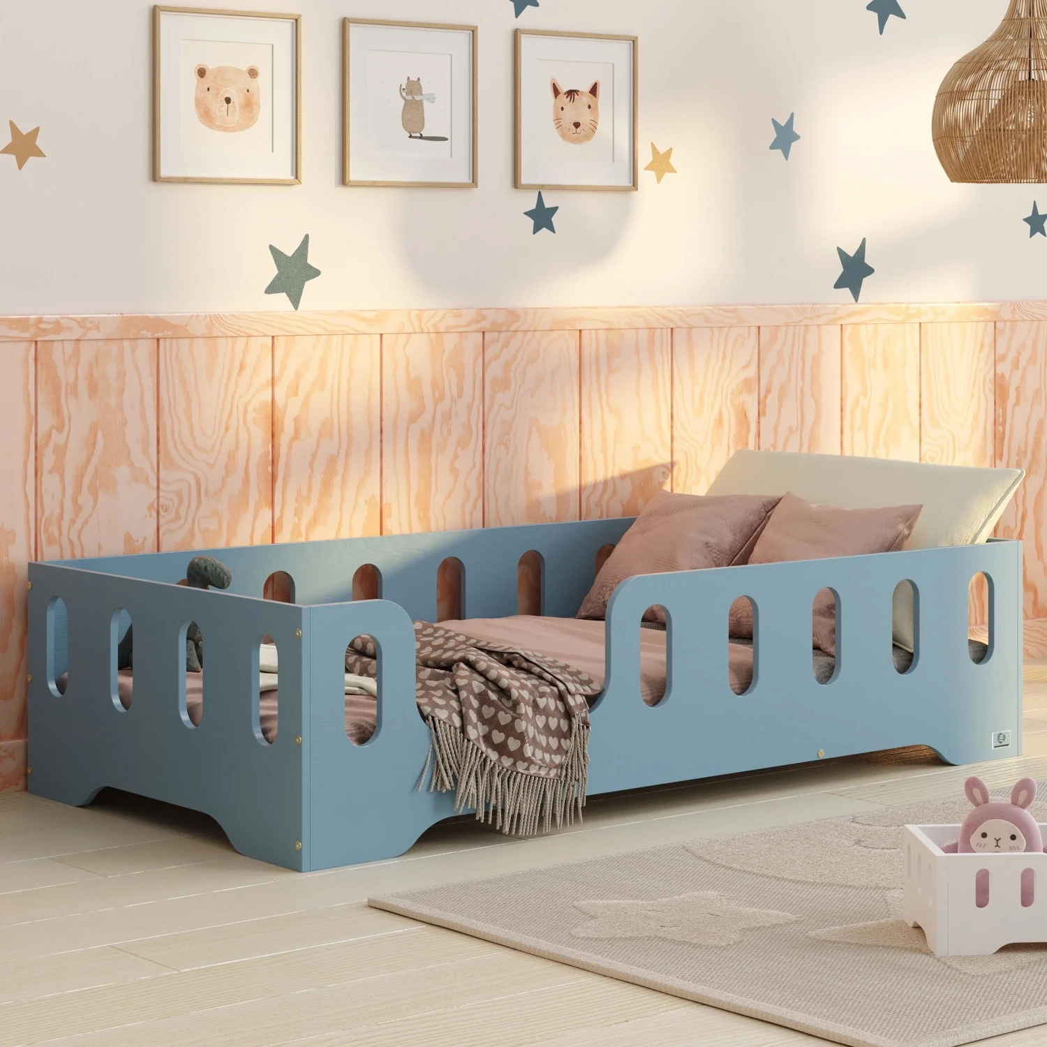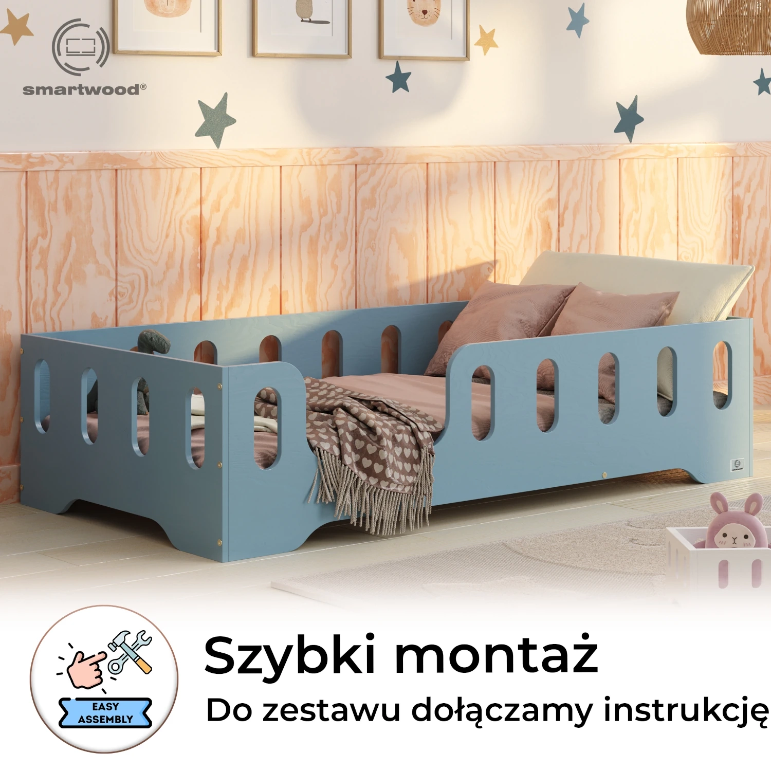 Łóżko pojedyncze dla dzieci z barierką i stelażem TILA 2 Montessori Drewniane