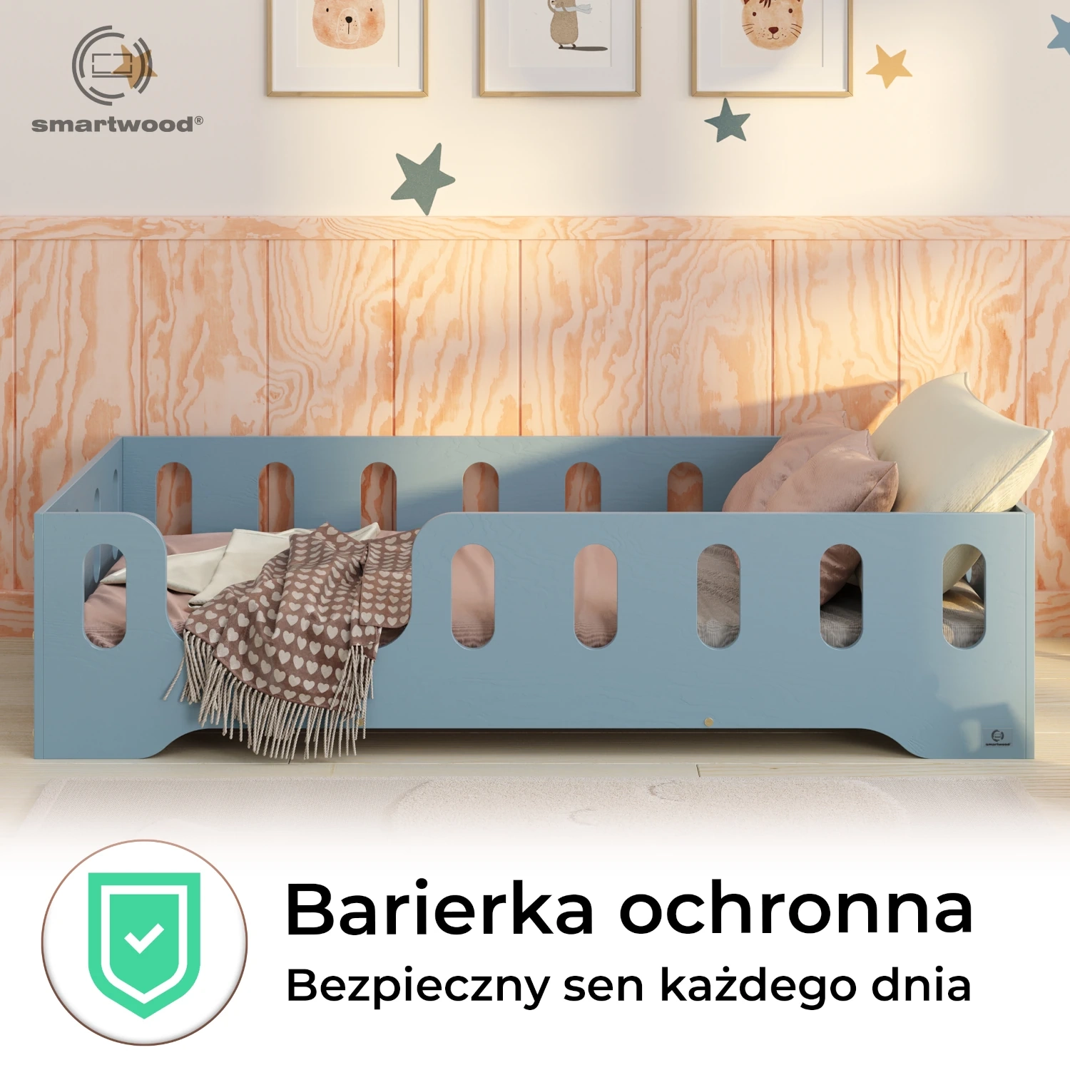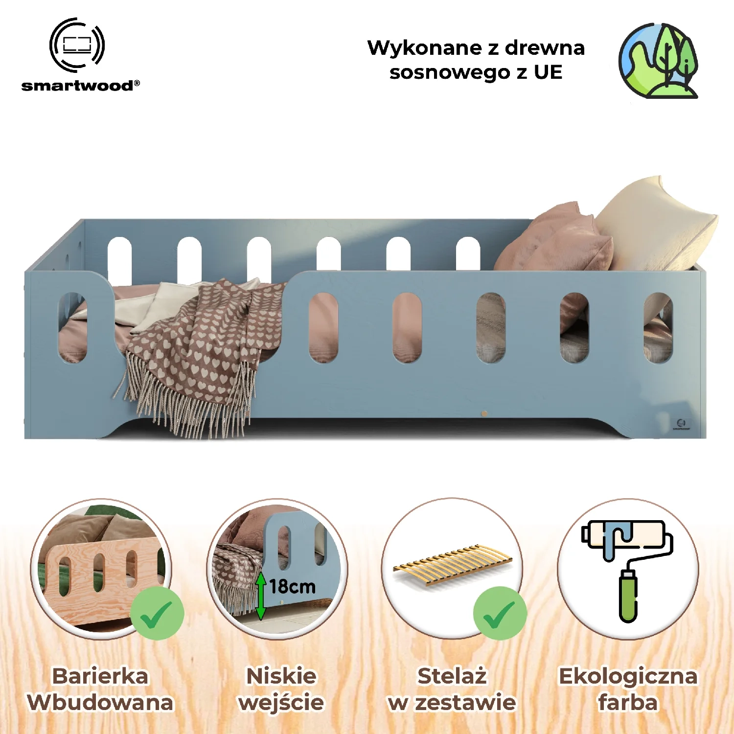 • Bezpieczne rozwiązanie: Wyposażone w przedłużone obrzeża, które chronią dziecko przed wypadnięciem podczas snu.