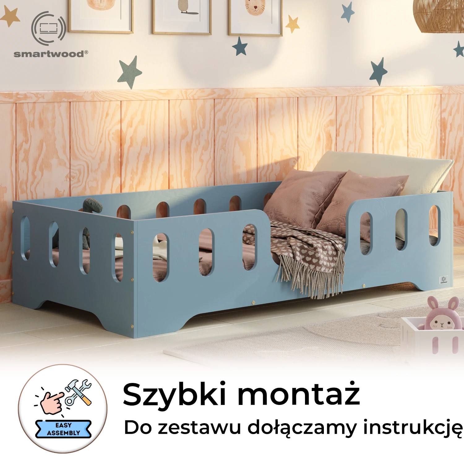 Łóżko pojedyncze dla dzieci z barierką i stelażem TILA 2 Montessori Drewniane