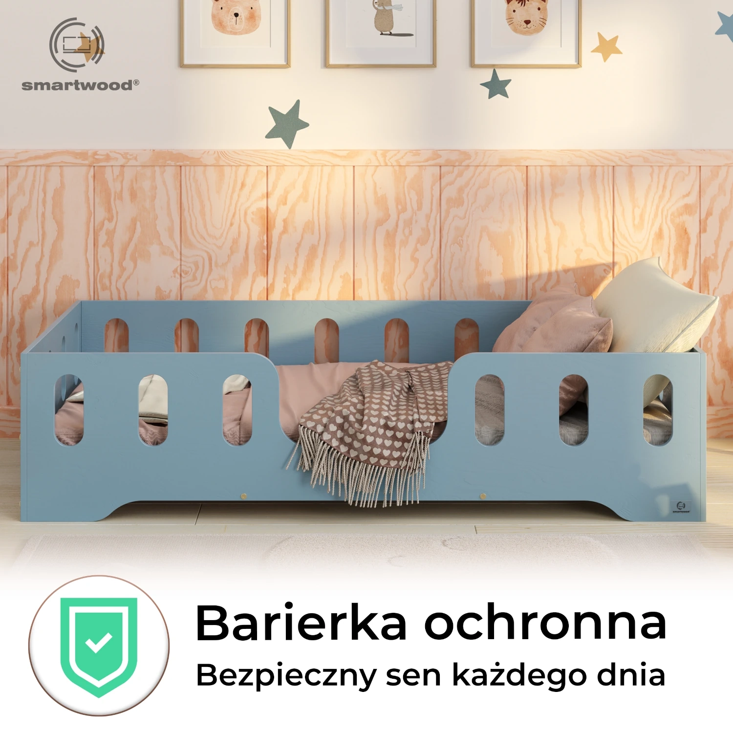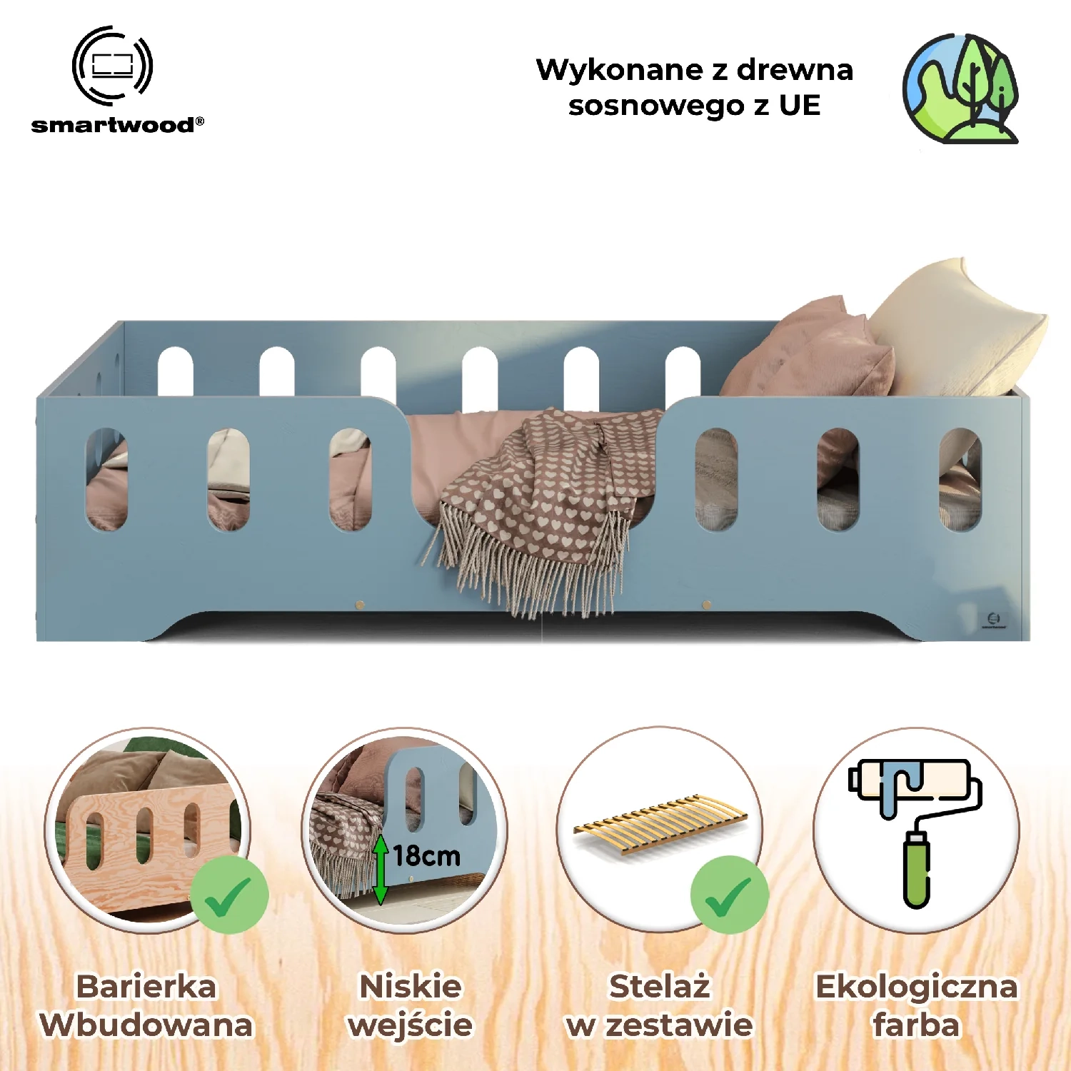 • Bezpieczne rozwiązanie: Wyposażone w przedłużone obrzeża, które chronią dziecko przed wypadnięciem podczas snu.