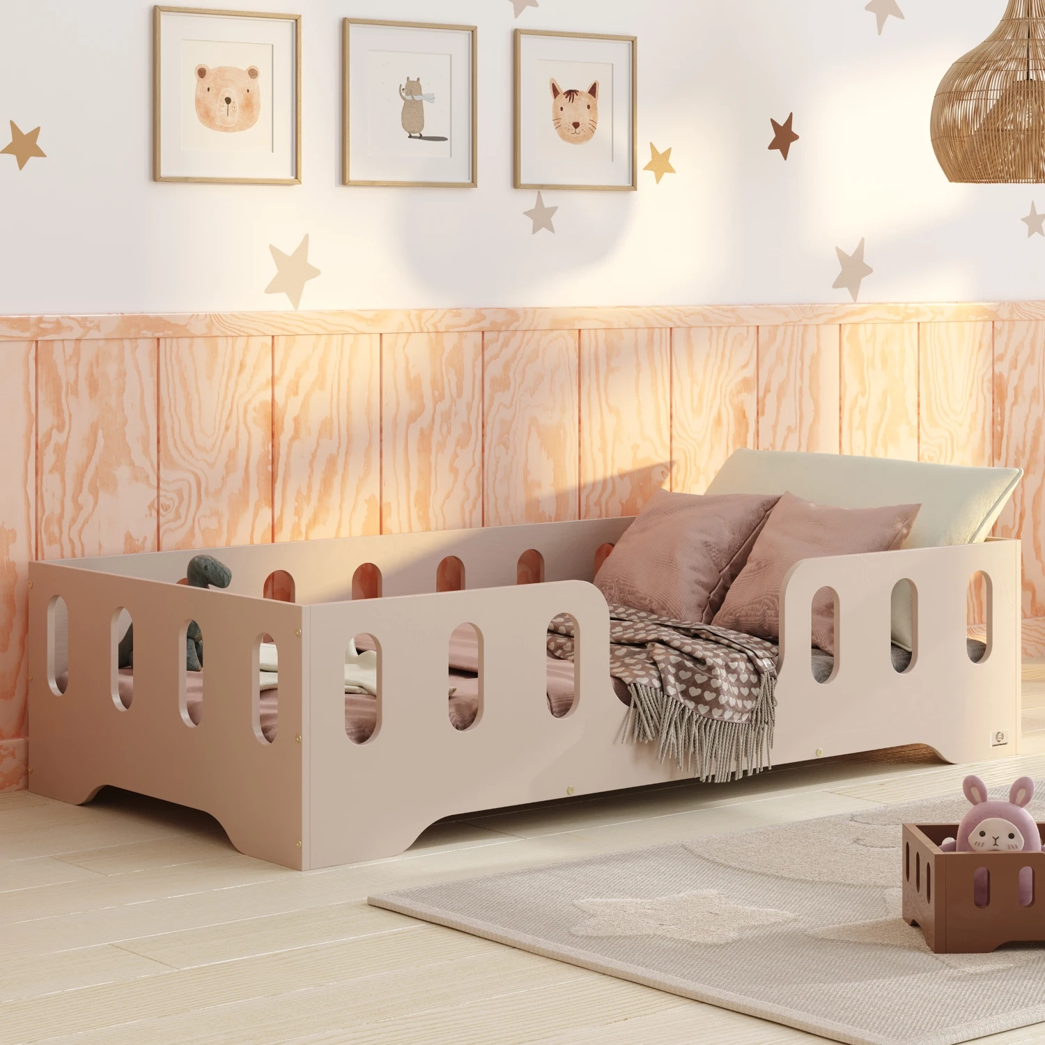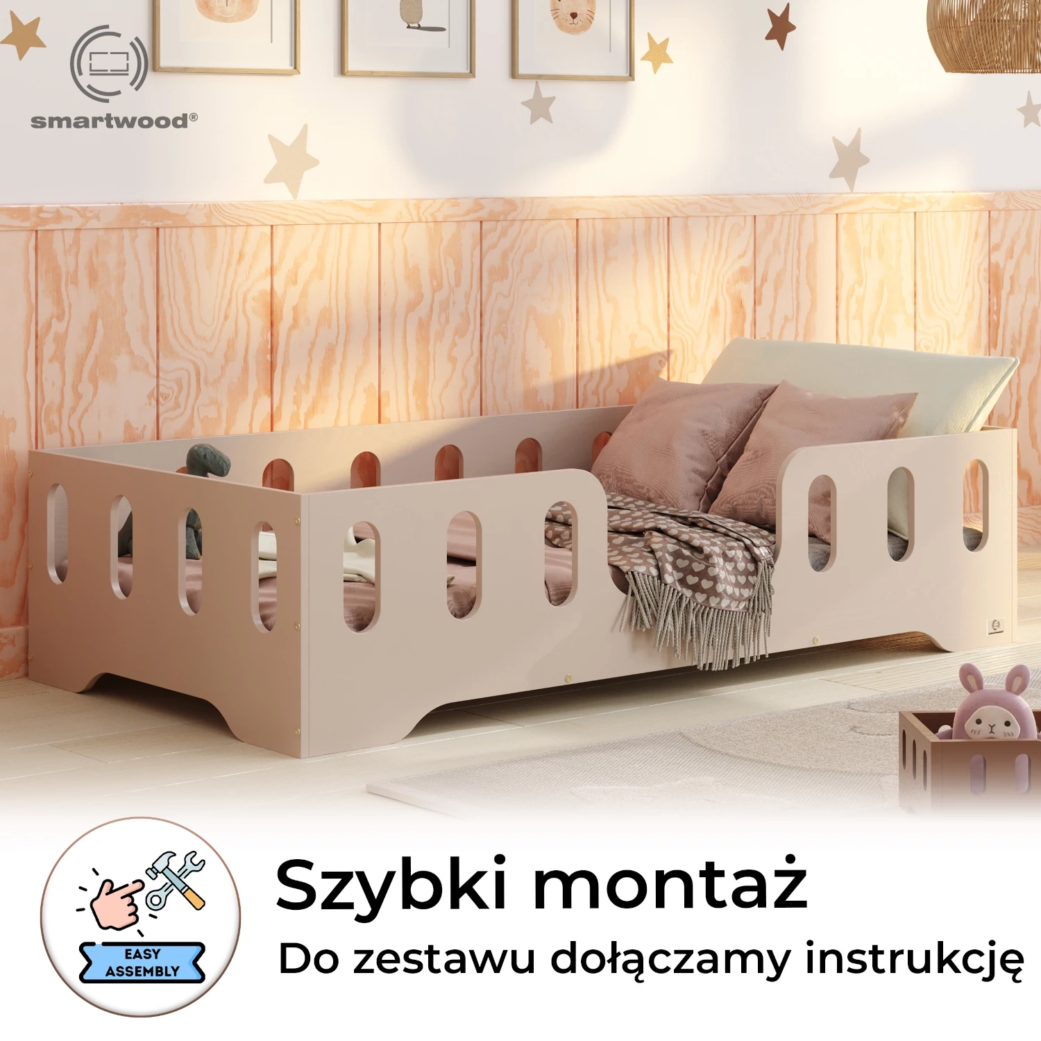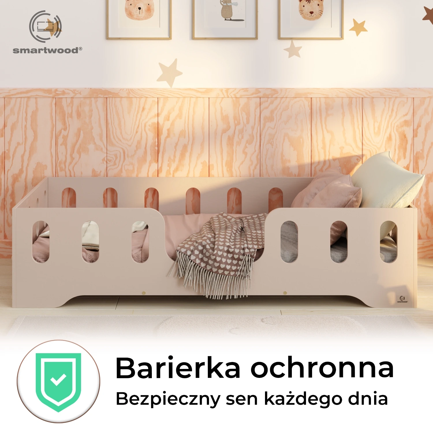 Łóżko pojedyncze dla dzieci z barierką i stelażem TILA 2 Montessori Drewniane
