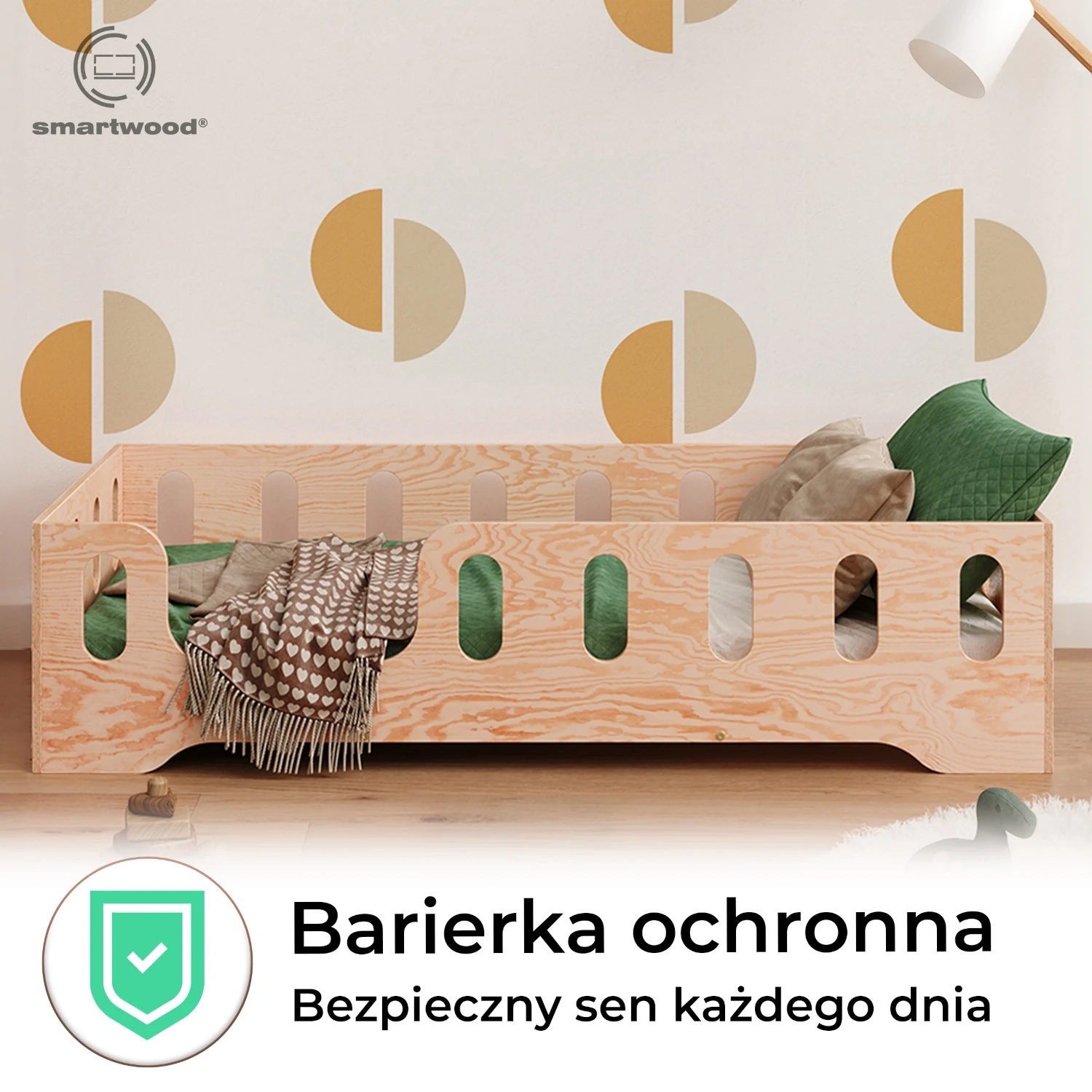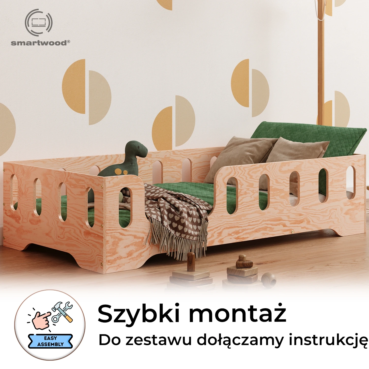 Łóżko pojedyncze dla dzieci z barierką i stelażem TILA 2 Montessori Drewniane