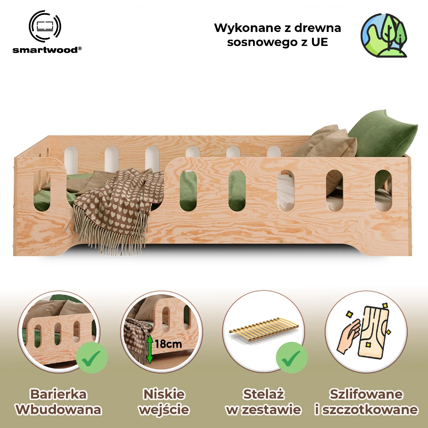 • Bezpieczne rozwiązanie: Wyposażone w przedłużone obrzeża, które chronią dziecko przed wypadnięciem podczas snu.