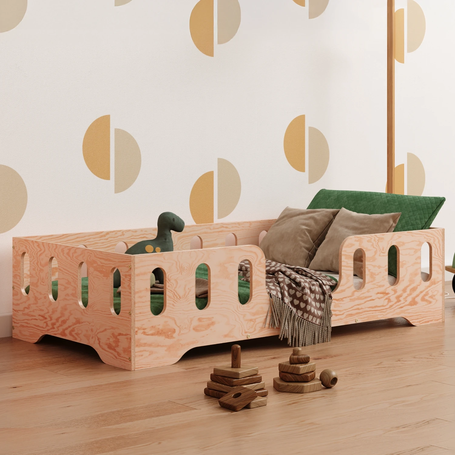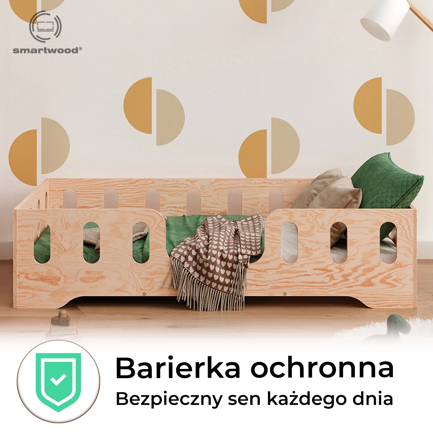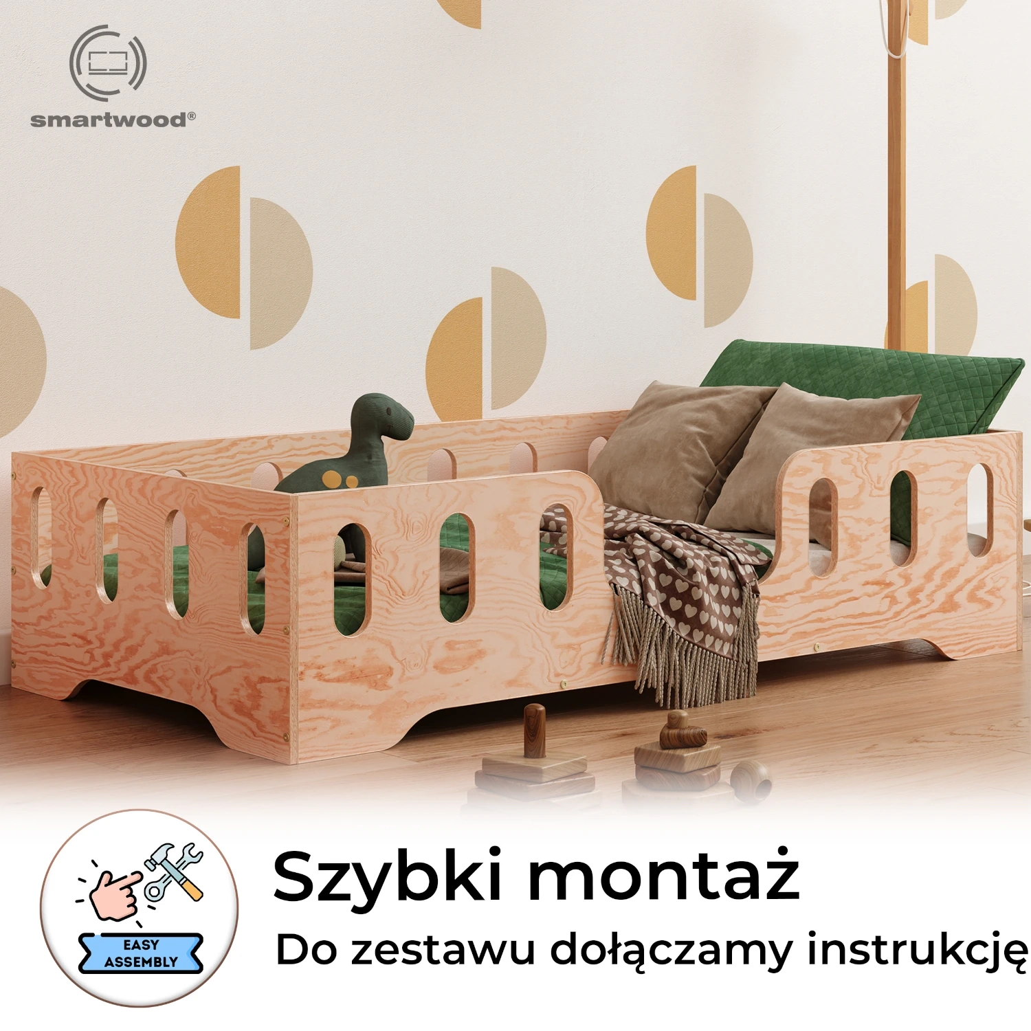 Łóżko pojedyncze dla dzieci z barierką i stelażem TILA 2 Montessori Drewniane