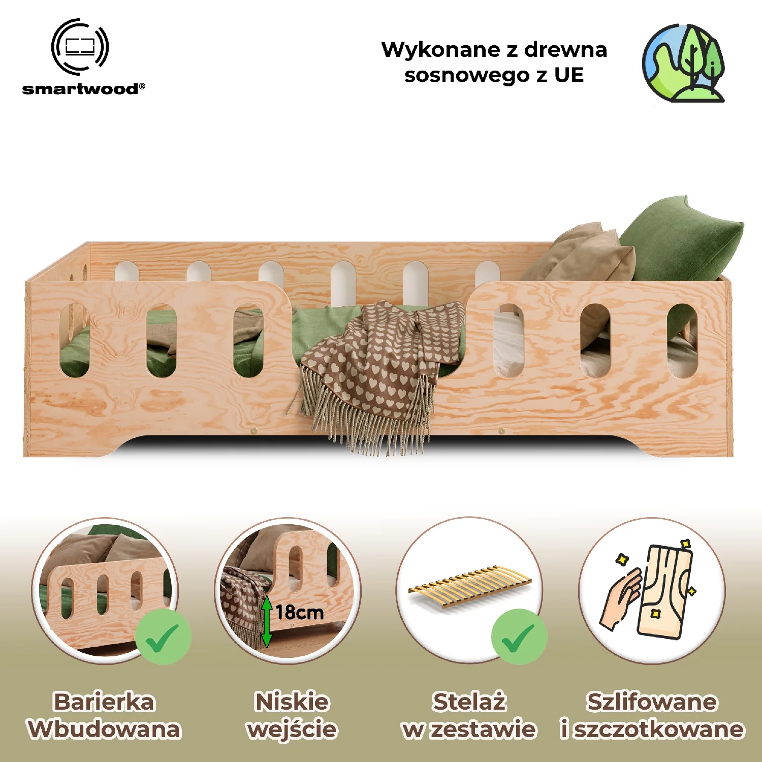 • Bezpieczne rozwiązanie: Wyposażone w przedłużone obrzeża, które chronią dziecko przed wypadnięciem podczas snu.