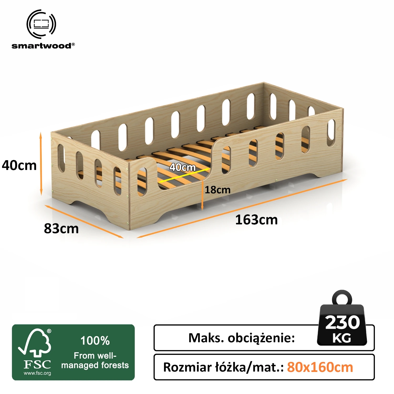 Łóżko pojedyncze dla dzieci z barierką i stelażem TILA 2 Montessori Drewniane