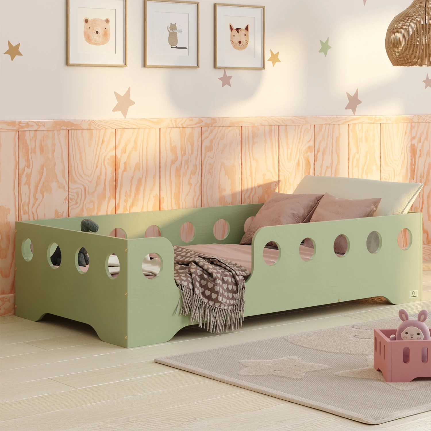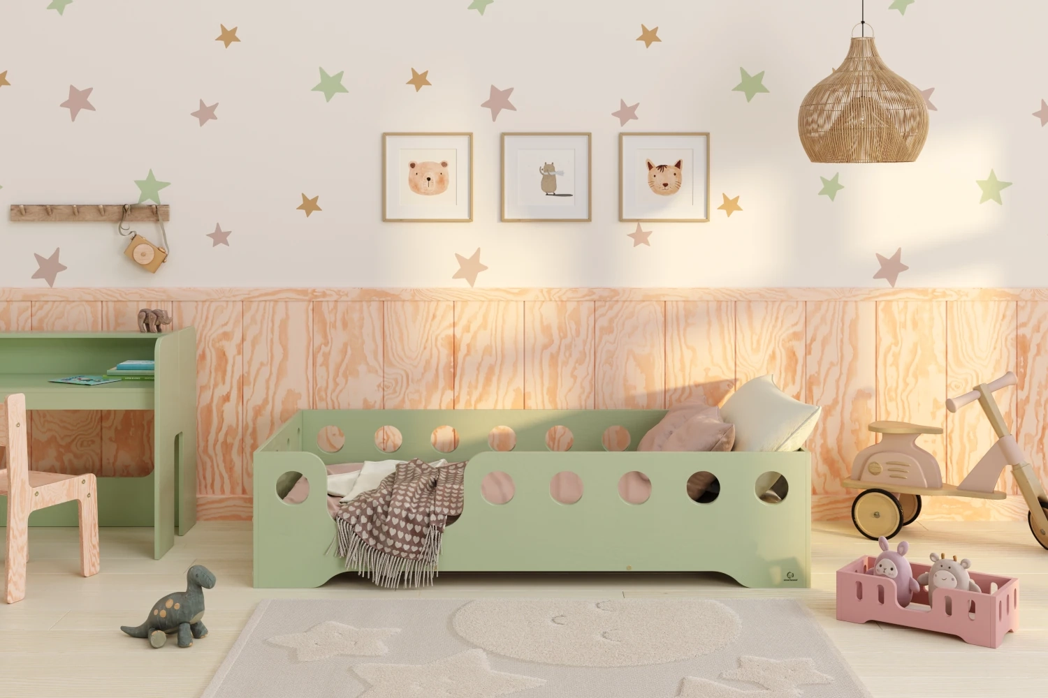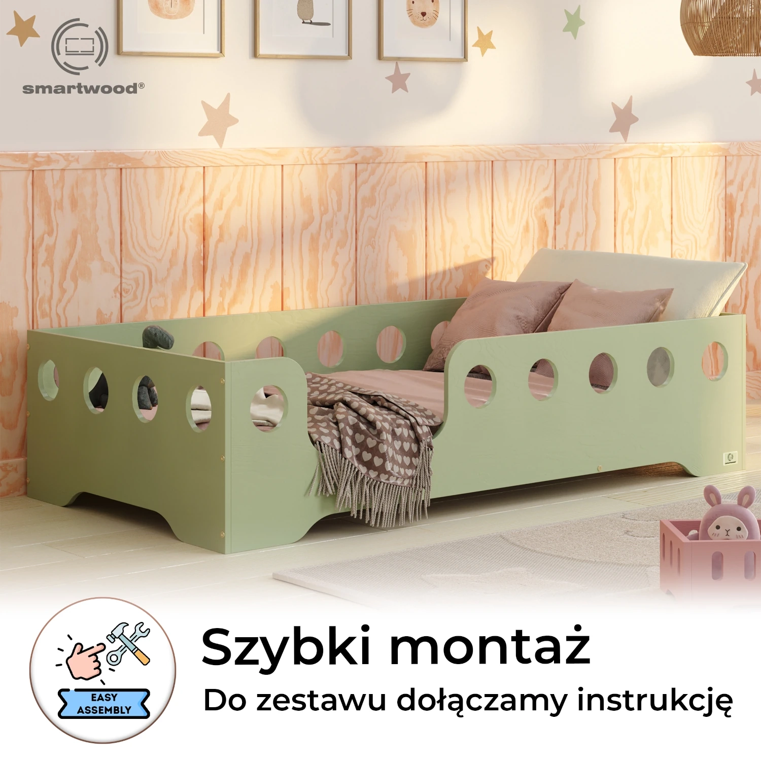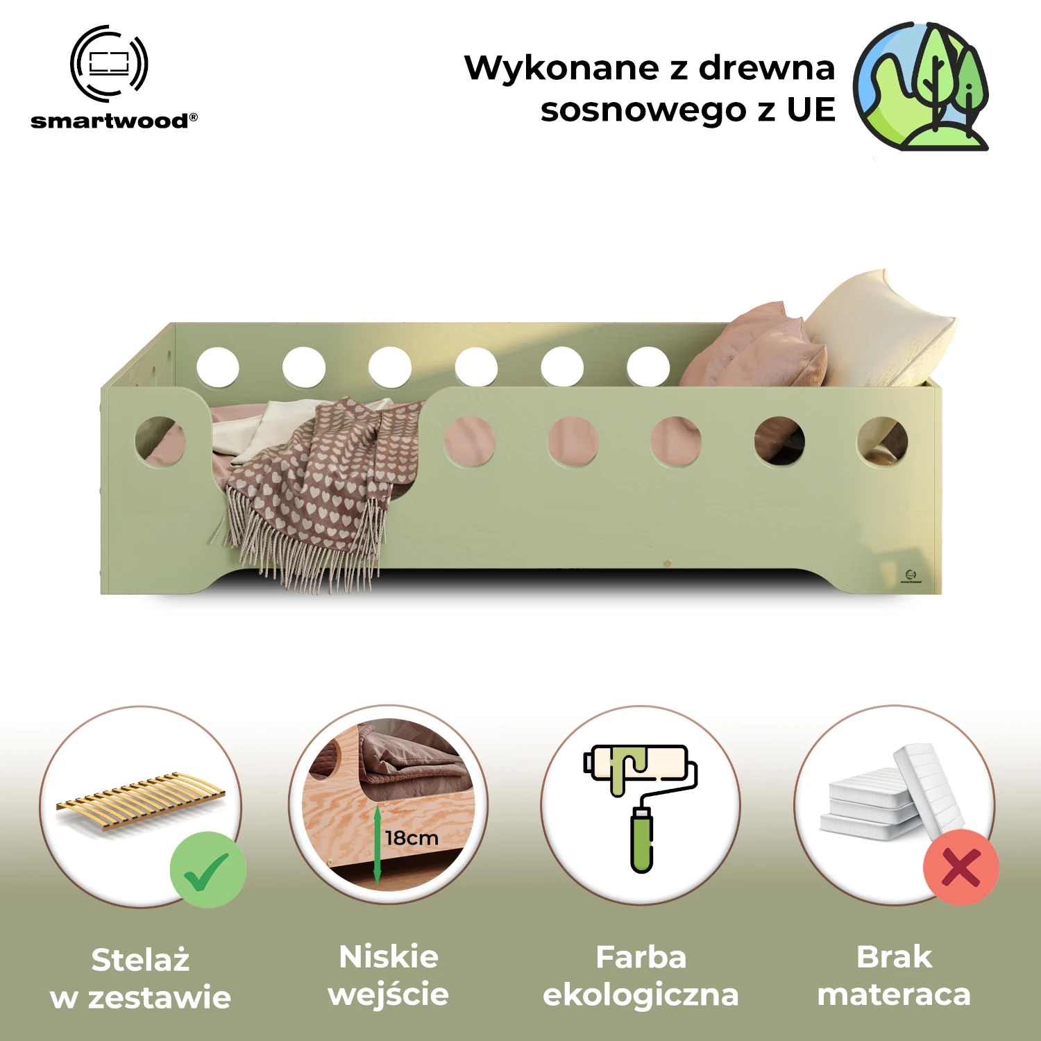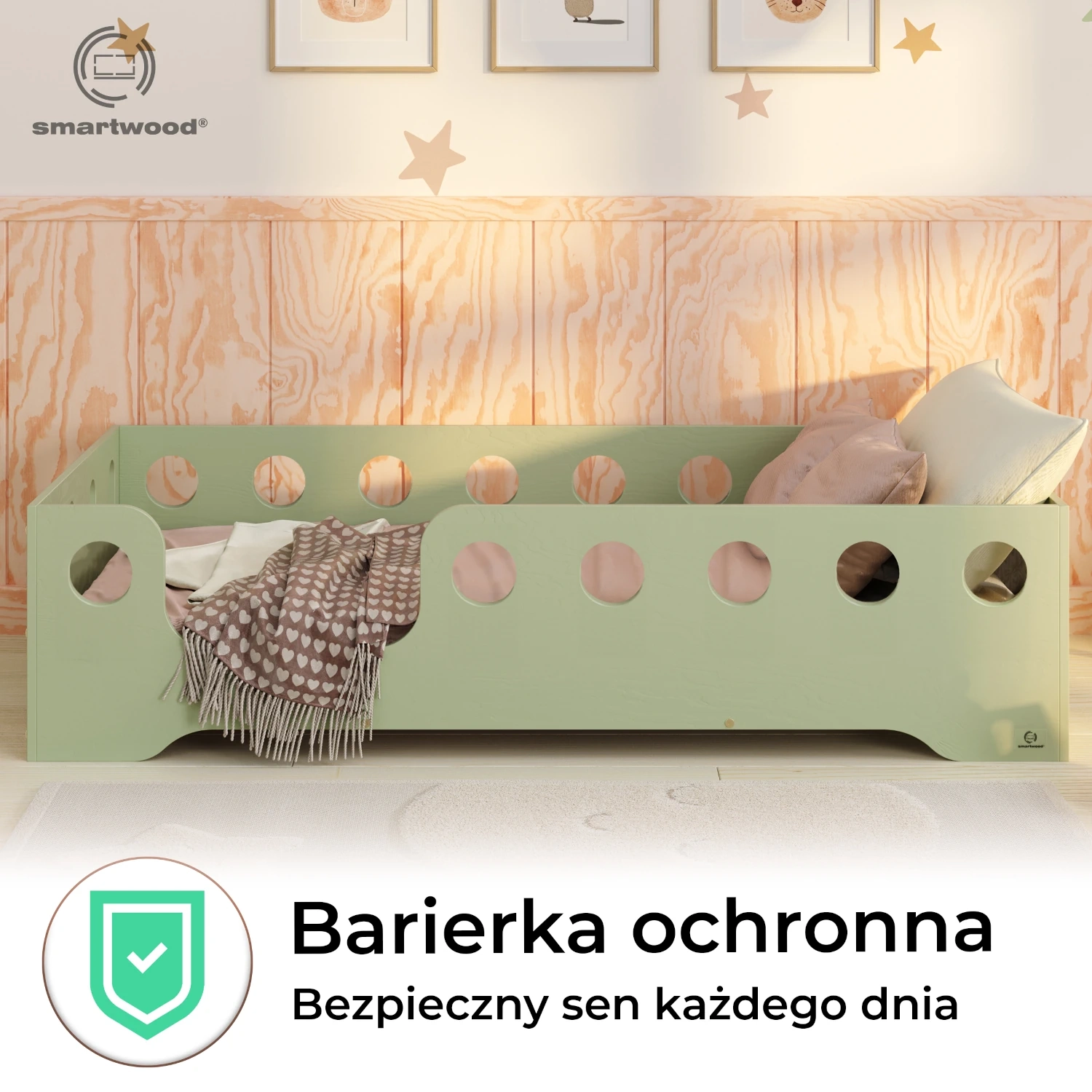 Łóżko pojedyncze dla dzieci z barierką i stelażem TILA 4 Montessori Drewniane