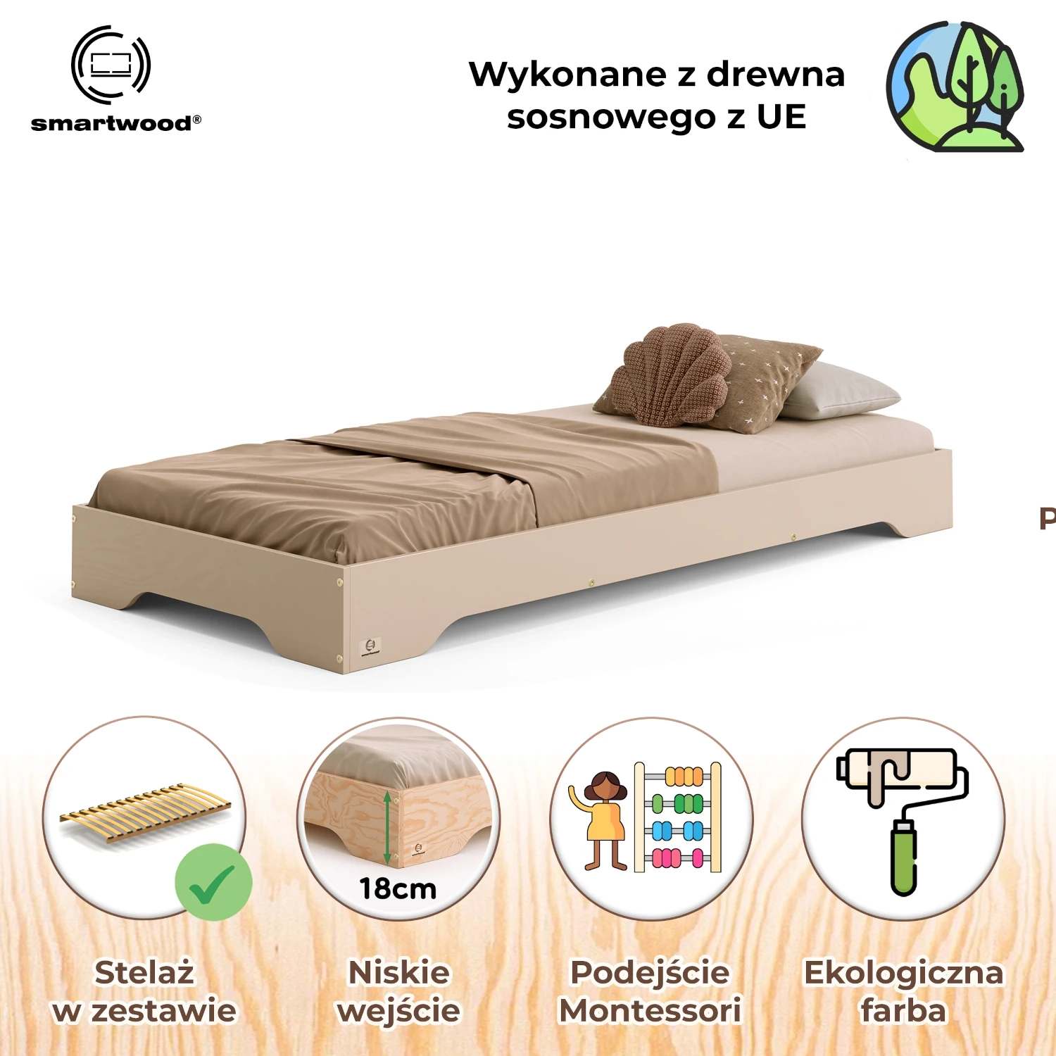 Łóżko pojedyncze TILA 7 zostało zaprojektowane w duchu filozofii Montessori, wspierając samodzielność i rozwój Twojego dziecka. Niskie łóżko dla dziecka umożliwia łatwe wchodzenie i schodzenie, co pomaga najmłodszym rozwijać niezależność już od pierwszych lat życia. Wykonane z wysokiej jakości sklejki sosnowej, dostępne w 11 kolorach i 23 rozmiarach, dzięki czemu pasuje do każdego wnętrza, oferując zarówno funkcjonalność, jak i estetykę. Gładkie, zaokrąglone krawędzie eliminują ryzyko urazów, zapewniając pełen komfort i bezpieczeństwo potwierdzone certyfikatem prestiżowego niemieckiego Instytutu Prüfengel. Dołączony w zestawie stelaż, o max. obciążeniu do 300 kg, sprawia, że łóżko jest gotowe do użytku od razu po złożeniu.