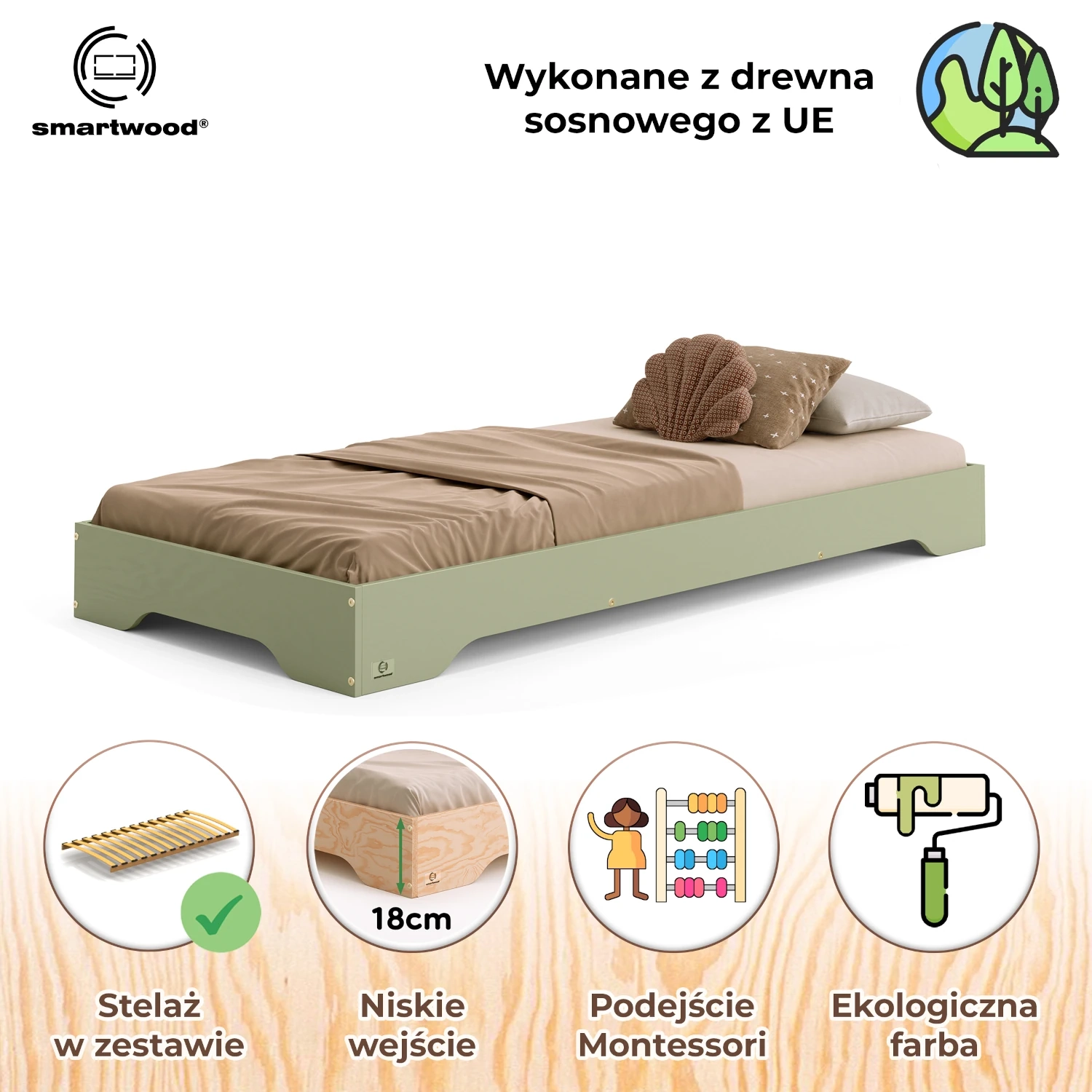 Łóżko pojedyncze TILA 7 zostało zaprojektowane w duchu filozofii Montessori, wspierając samodzielność i rozwój Twojego dziecka. Niskie łóżko dla dziecka umożliwia łatwe wchodzenie i schodzenie, co pomaga najmłodszym rozwijać niezależność już od pierwszych lat życia. Wykonane z wysokiej jakości sklejki sosnowej, dostępne w 11 kolorach i 23 rozmiarach, dzięki czemu pasuje do każdego wnętrza, oferując zarówno funkcjonalność, jak i estetykę. Gładkie, zaokrąglone krawędzie eliminują ryzyko urazów, zapewniając pełen komfort i bezpieczeństwo potwierdzone certyfikatem prestiżowego niemieckiego Instytutu Prüfengel. Dołączony w zestawie stelaż, o max. obciążeniu do 300 kg, sprawia, że łóżko jest gotowe do użytku od razu po złożeniu.